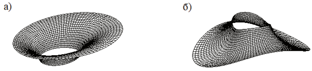 Рисунок 11 – Поверхности при разных значениях параметра n, который соответствует количеству складок: а) при n = 1 получается дважды циклическая поверхность Иоахимсталя – отсек циклиды Дюпена; б) при n = 2 поверхность напоминает шляпу