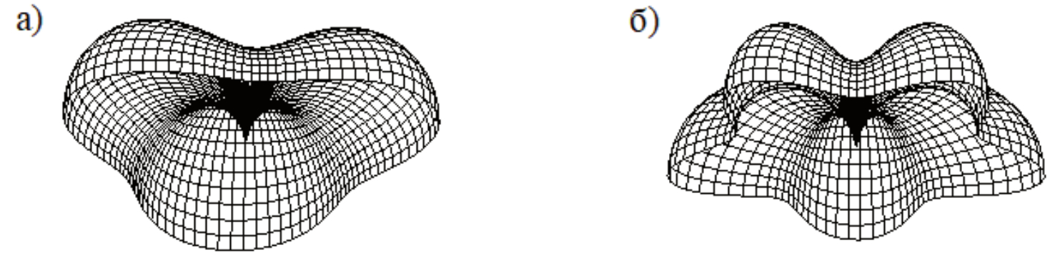 Рисунок 11 – Поверхности при разных значениях параметра n, который соответствует количеству складок: а) при n = 1 получается дважды циклическая поверхность Иоахимсталя – отсек циклиды Дюпена; б) при n = 2 поверхность напоминает шляпу