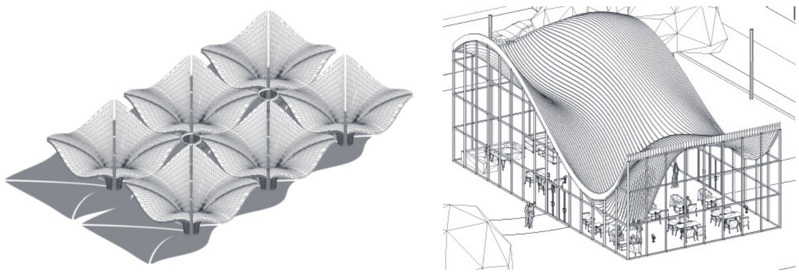 На примерах показаны широкие возможности формообразования циклических поверхностей Иоахимсталя, которые рекомендованы для использования в проектировании складчатых оболочек, благодаря следующим свойствам: