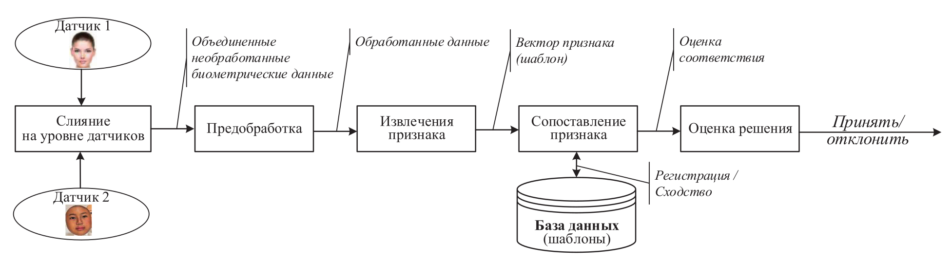 Слияние на уровне датчиков – объединение необработанных данных, полученных с различных биометрических датчиков, в один вектор. Информация одного и того же биометрического признака, полученного с различных датчиков, объединяется для получения единого биометрического признака. Т.е. дополнительная информация, соответствующая, например, отпечаткам пальцев, которая может быть получена с использованием различных типов датчиков, интегрируется с использованием метода слияния на уровне датчиков. Другой пример – изображения лиц, полученные с нескольких камер, могут быть объединены для формирования единого изображения лица.