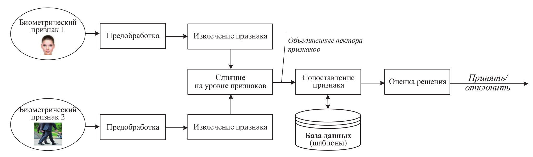 Слияние на уровне признаков – слияние векторов признаков, которые получены либо с использованием нескольких датчиков, либо с использованием нескольких алгоритмов извлечения признаков из одних и тех же датчиков (векторы признаков одного биометрического признака, полученные от разных датчиков; векторы признаков одного биометрического признака, полученные от разных объектов (векторы признаков отпечатков пальцев левой и правой руки); векторы признаков, сгенерированные из нескольких биометрических признаков) (рисунок 8).