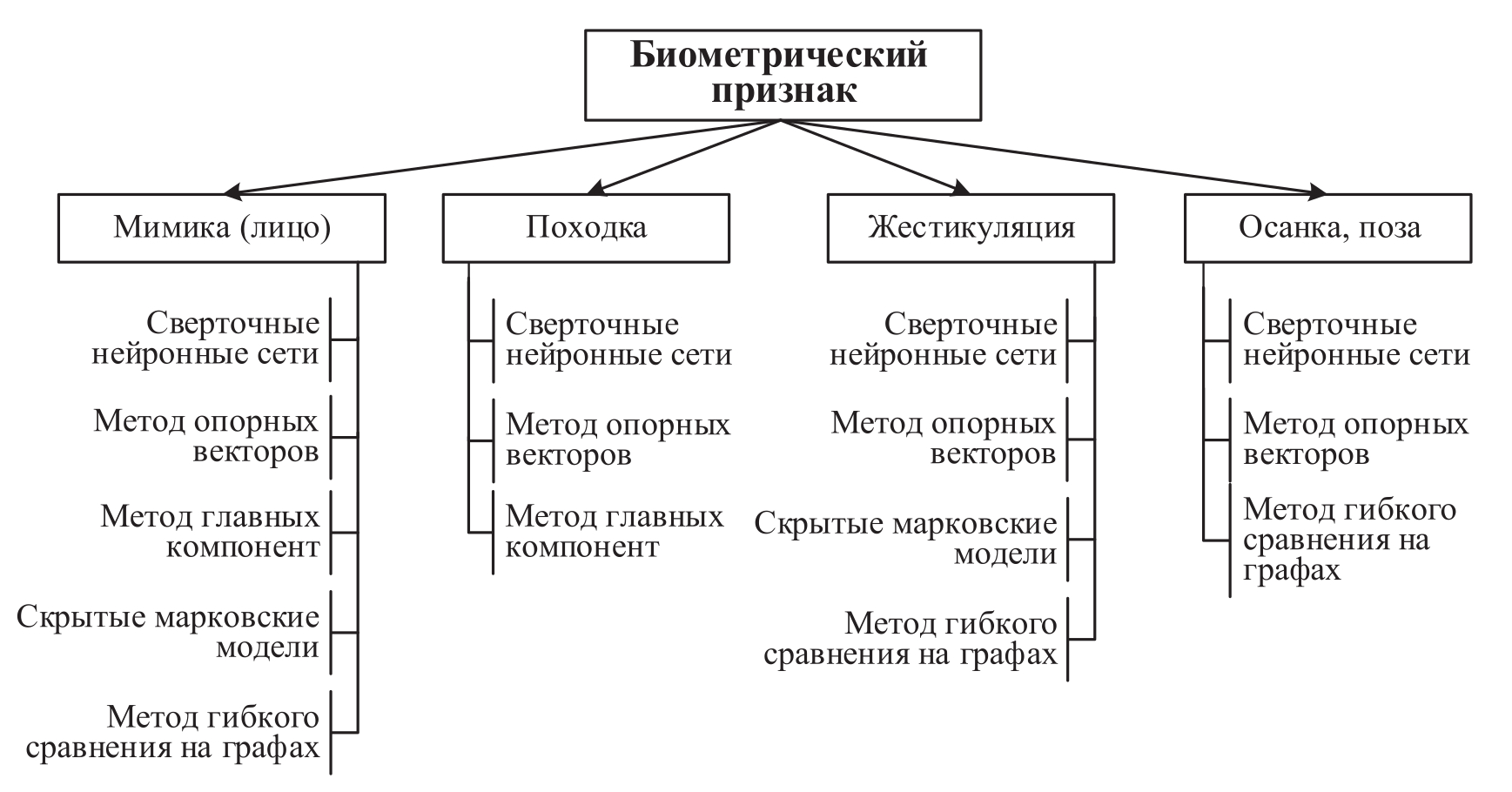 В настоящее время системы распознавания человека подразделяются на несколько видов (рисунок 4, адаптирован по материалам [24, 31-33]).