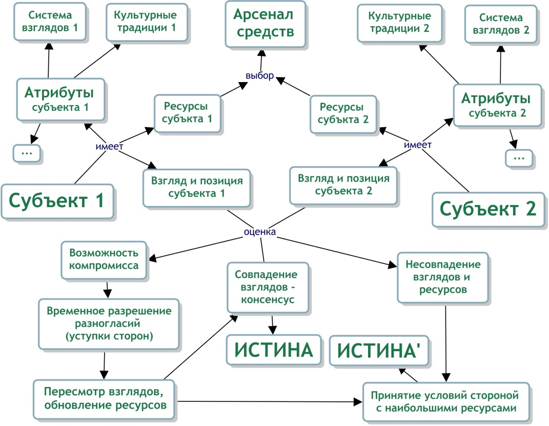 Бозон Хиггса настолько важен для понимания тонкой структуры микромира, что его прозвали «частицей Бога». Его нестабильность, случайность, непредсказуемость во многом характерны и определяют эволюцию. Также обстоит дело и с Истиной, которая всегда субъектна, контекстна и зависит от арсенала средств и ресурсов сторон (см. рисунок на 471 с.).