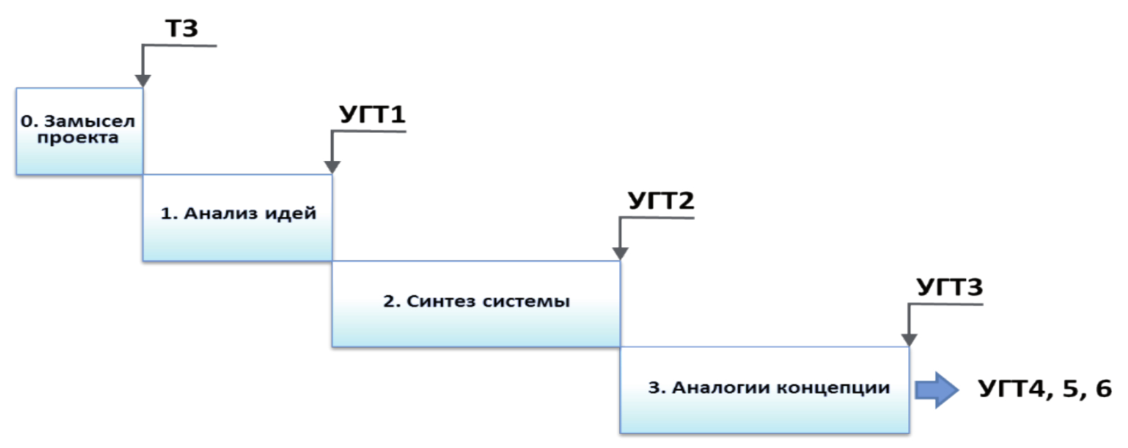 В работе [1] представлены теоретические основы управления разработкой технических концепций в области авиастроения. На основе теории множеств, векторного анализа и теории систем разработаны формально-логические модели последовательных этапов, составляющих процесс концептуального проектирования согласно техническому заданию (ТЗ) с повышением уровня готовности технологий (УГТ, см. рисунок 1). Показано, что управление проектом неотделимо от управления техническими рисками.