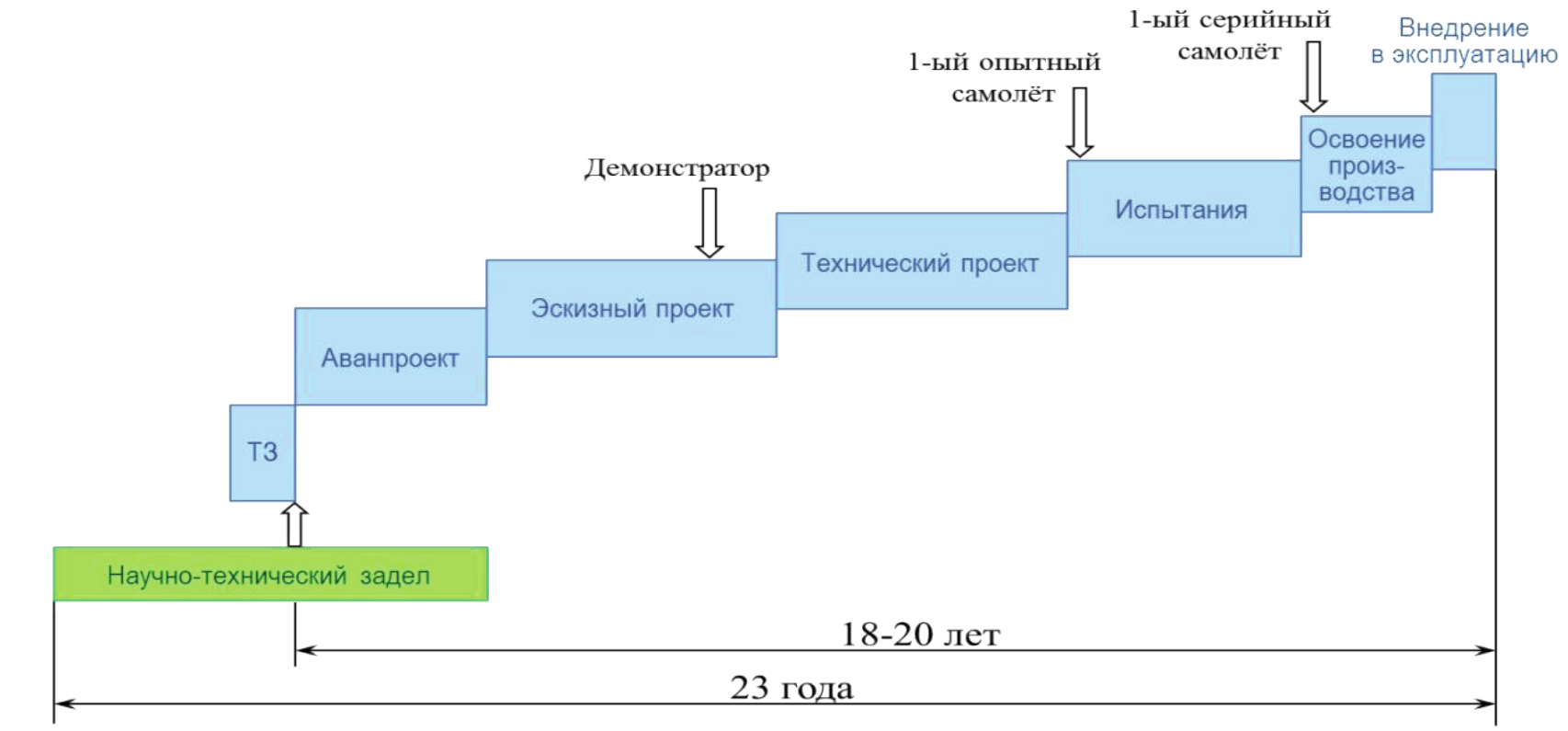 Цель этапа – оценить потребность в новом проекте и обосновать ТЗ на его осуществление. Источником знаний на этапе являются результаты различных исследований, которые выполняются специальными методами, объединёнными в согласованную систему или единый план получения знаний, необходимых для обоснования и инициации проекта самолёта (см. рисунок 2). При создании нового летательного аппарата (ЛА) требуется кооперация множества предприятий и продолжительное время разработки до момента освоения его в эксплуатации (см. рисунок 3).