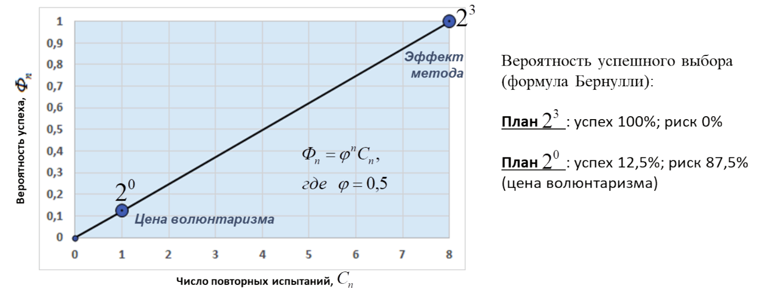 Трудоёмкий процесс разработки и изучения множества технических обликов создаёт «сопротивление» случайному, необоснованному выбору. Проведение полнофакторного эксперимента с полезными идеями и всеми возможными техническими обликами исключает неполноту рассмотрения и риск ошибки, гарантирует 100%-ый успех поиска рационального решения проектной задачи с апробацией n – конкретных новых принципов в концепции самолёта (на рисунке 8 пример для n=3). Рассмотрение 1-2 вариантов из числа возможных может удовлетворить их автора, но делает успех проекта маловероятным. Отметим, что большая трудоёмкость «Анализа идей» ограничивает практическую сложность этой задачи.