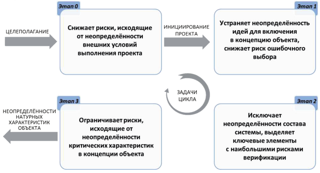 При этом концепция объекта на Этапе 1 не является ни полноценной, ни завершённой. Причина в том, что модель объектовой протосистемы , представленная в ТО самолёта, далека по своему содержанию от многоуровневого и многодисциплинарного описания объекта , которое позволит довести концепцию до уровня технического предложения: По окончании Этапа 1 устраняется риск применения ошибочных идей, хотя и сохраняется неопределённость состава и свойств элементов системы в выбранной концепции самолёта (рисунок 9).