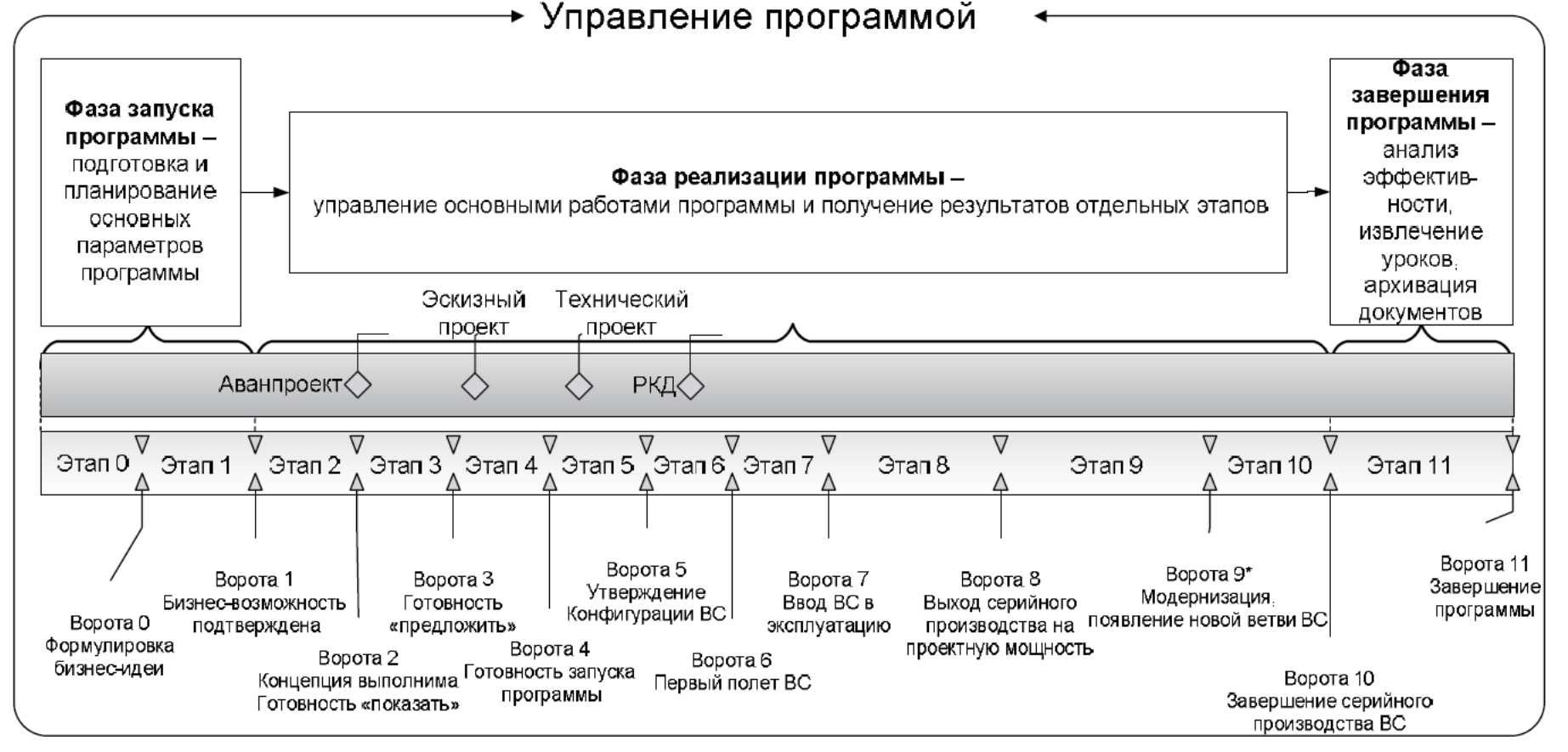 Действующий на современных авиастроительных предприятиях ОАК «Порядок управления авиационными программами» включает этапы 0, 1, 2, 3 (рисунок 18), по своим задачам аналогичным порядку концептуального проектирования на рисунке 1.