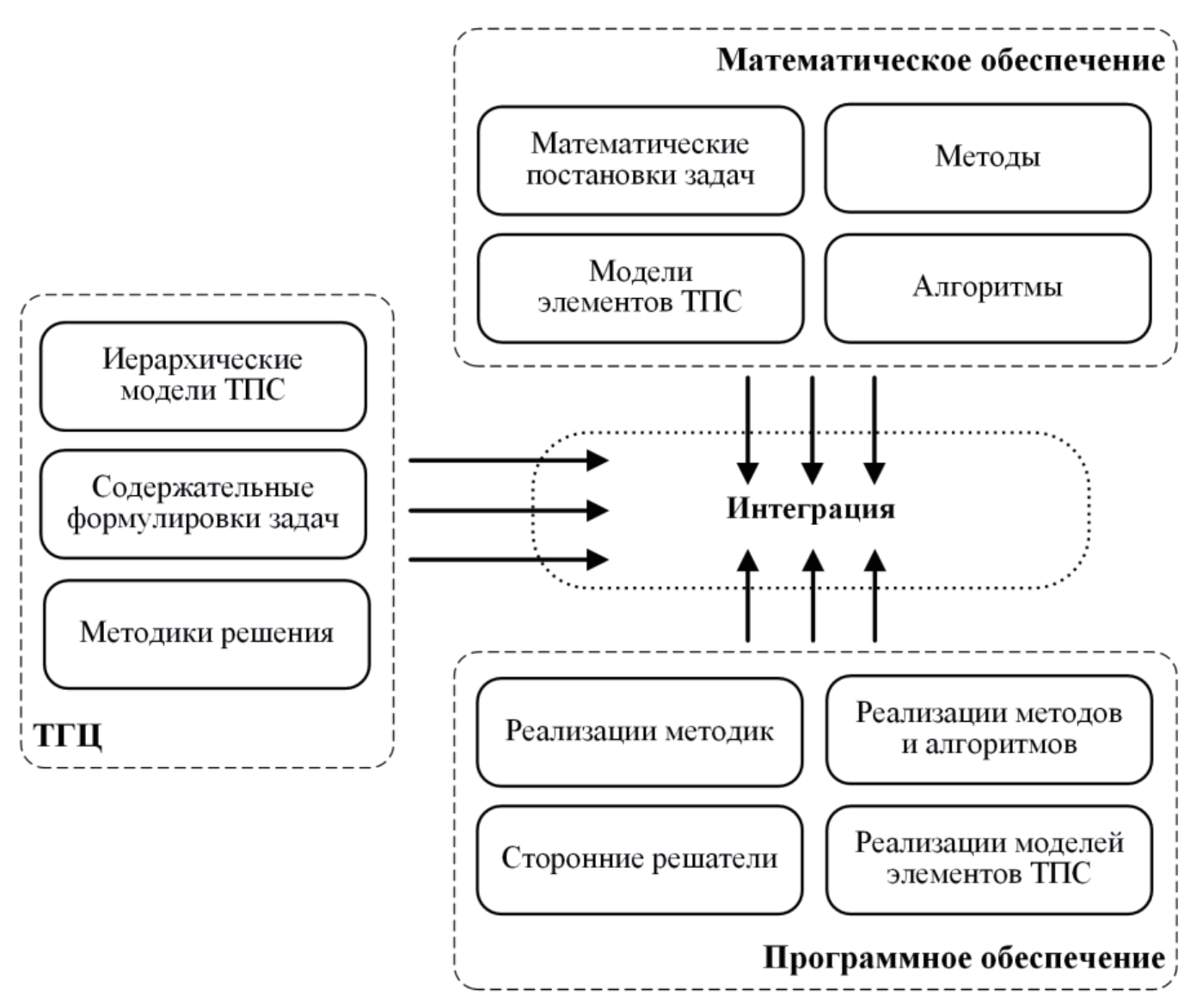 ТГЦ является базой для решения задач проектирования ТПС. В данном исследовании модель ТПС – это иерархически построенный объект, в котором какая-либо подсистема на одном уровне рассматривается как совокупность связанных элементов, а на более высоком уровне – как единый элемент с агрегированными характеристиками. Для решения задач проектирования ТПС применяется специализированное математическое и ПО. Математическое обеспечение включает математические постановки задач проектирования, модели элементов ТПС, методы и алгоритмы. ПО включает программные компоненты, которые реализуют методики проектирования ТПС, модели элементов ТПС, а также решатели – готовые программные разработки, предназначенные для решения конкретных классов задач.