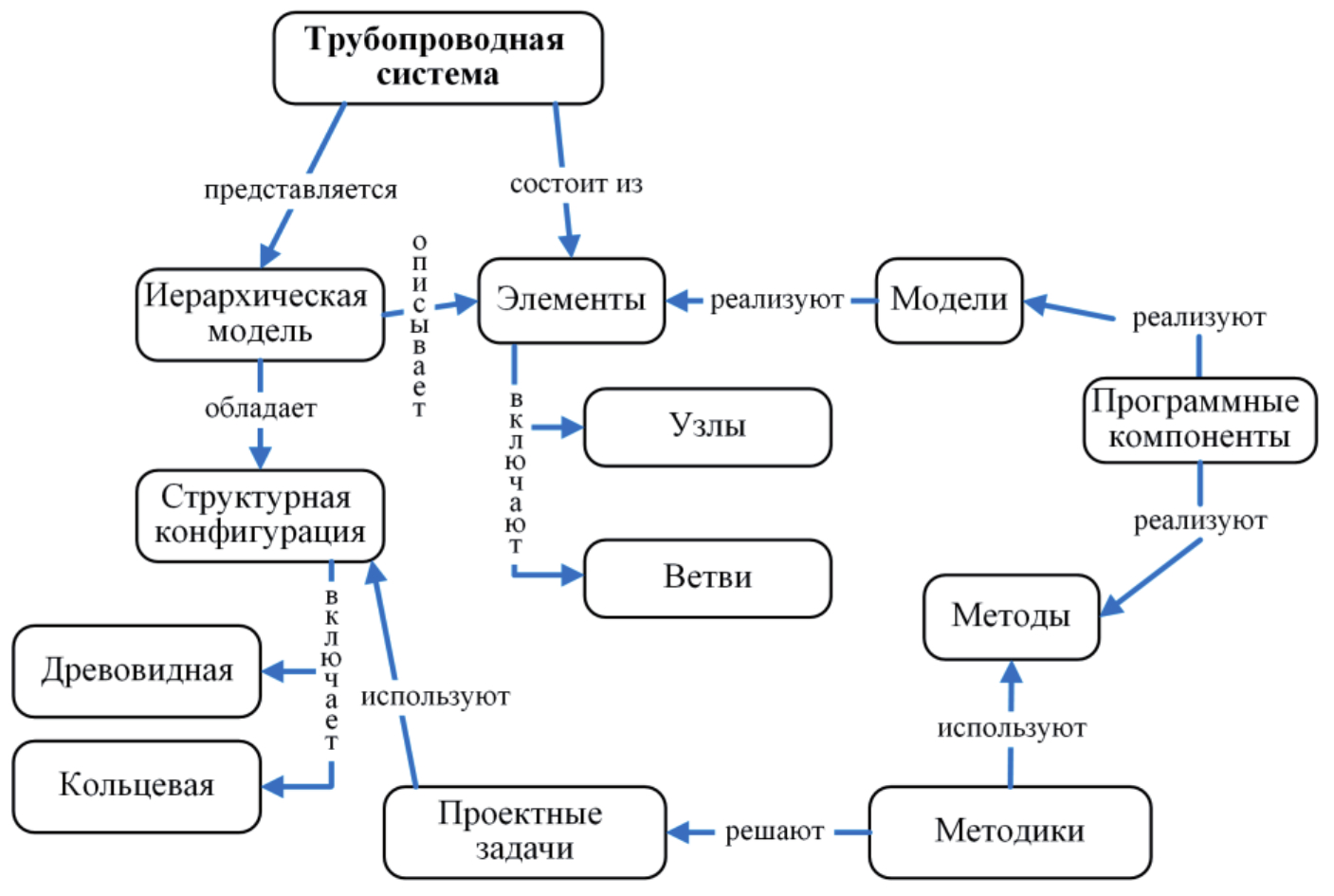 «Трубопроводная система» состоит из «Элементов», которые подразделяются на «Узлы» и «Ветви» (см. рисунок 4). «Трубопроводная система» представляется «Иерархической моделью», отражающей «Структурную конфигурацию», которая может быть «Древовидной» или «Кольцевой». «Программные компоненты» включают программные реализации «Моделей», соответствующих «Элементам», и «Методов», используемых «Методиками». «Проектные задачи» учитывают «Структурную конфигурацию».
