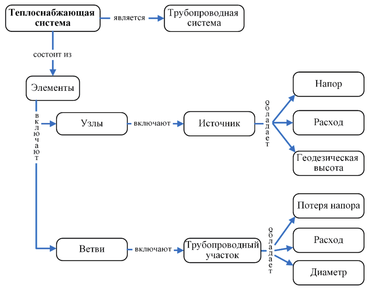 Онтологии ТПС конкретных классов включают следующие составляющие: описание отдельных классов ТПС (тепло-, газо-, водоснабжения и т.д.), классификацию используемого оборудования и его технические характеристики, описание подсистем и элементов ТПС и их свойств (технических характеристик, рабочих параметров и граничных условий), классификацию и описание используемых ММ (например, уравнения, описывающие законы падения напора на ветвях сети, формулы расчёта сопротивлений и др.).