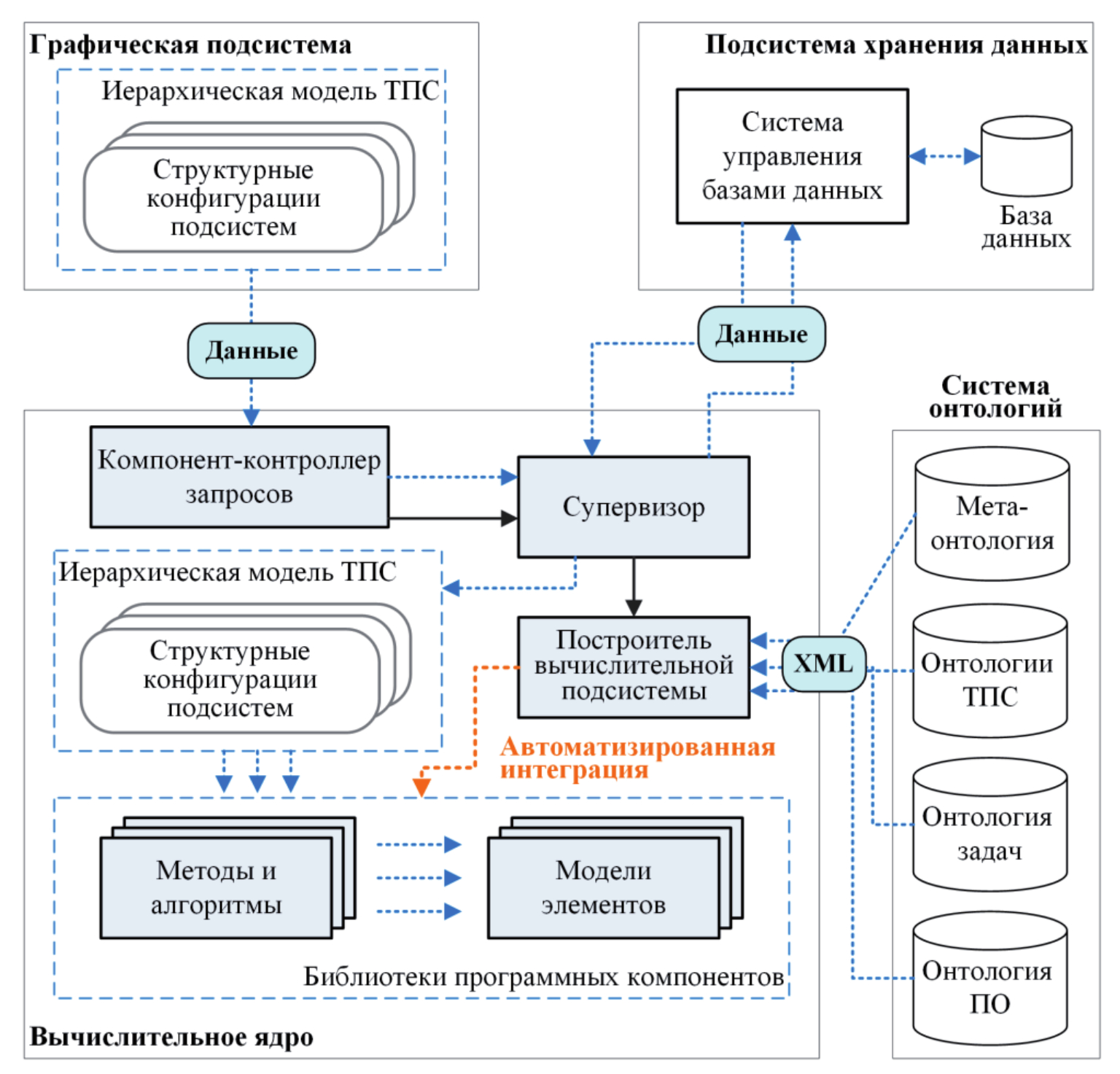 Проектирование осуществляется на основе интеграции представленных на рисунке 1 составляющих в рамках единого процесса моделирования ТПС. Вследствие различия ТПС и их подсистем возникает необходимость автоматизации организации вычислительного процесса для достижения необходимой гибкости в адаптации на особенности конкретной ТПС.