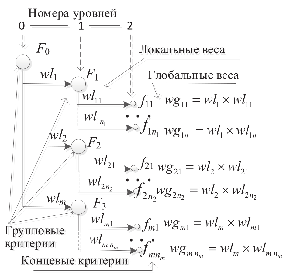 Для объектов с многоуровневой структурой характерно представление системы критериев в виде иерархического дерева [1–3]. При этом возникает проблема оценки количественной важности локальных критериев, входящих в вершину более высокого уровня.