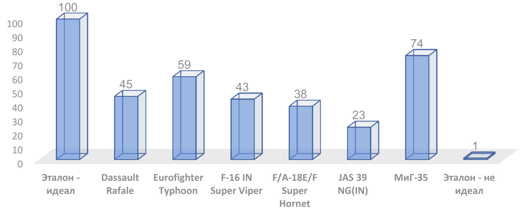 На первом месте оказался самолёт МиГ-35 так как по трём показателям у него максимальные баллы. Кроме того, преимущество самолёта связано с наличием управляемого вектора тяги, который отсутствует у других самолётов.