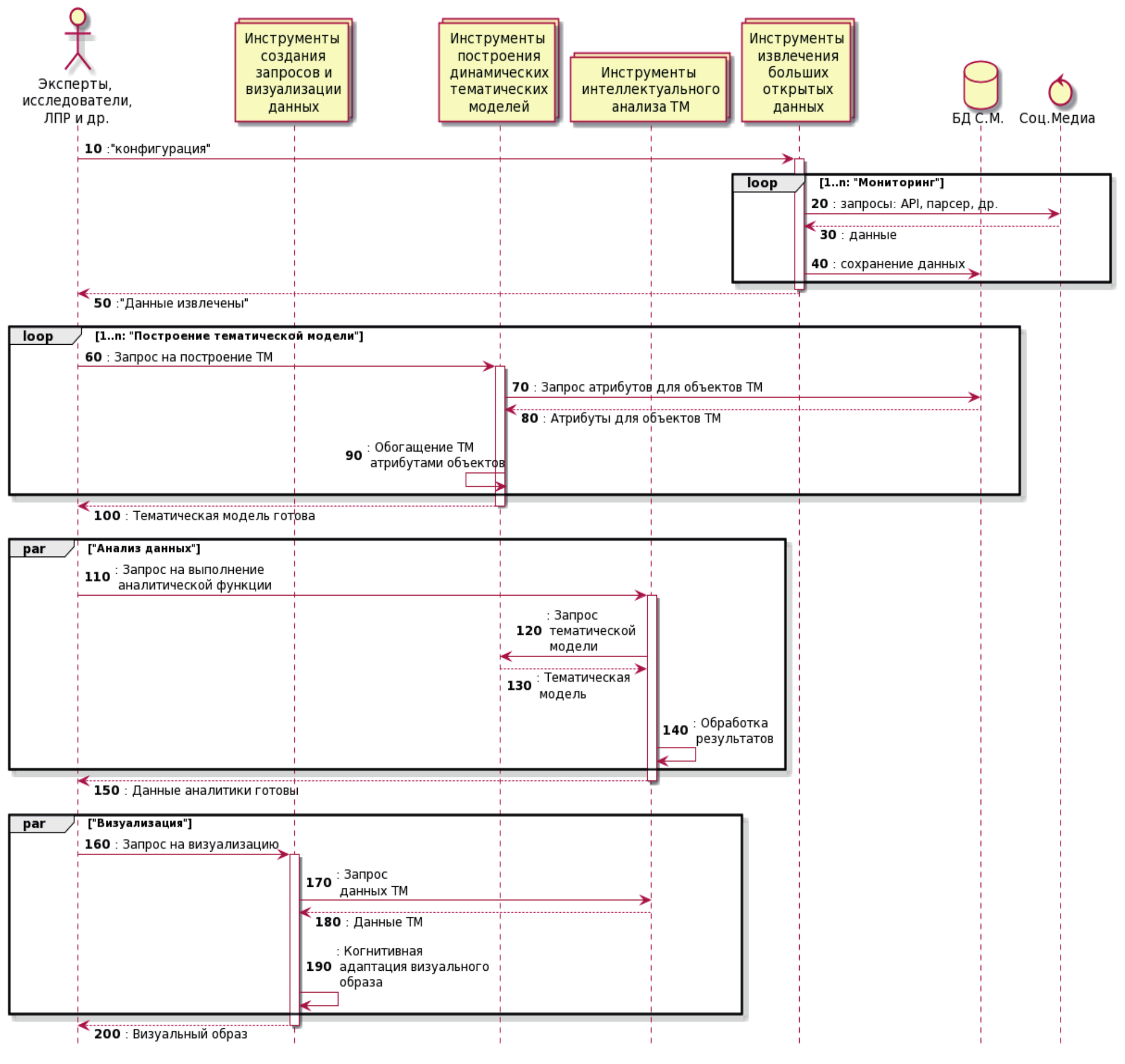 На рисунке 2 в виде диаграммы последовательности UML представлен пример использования разработанных технологий для исследования динамических свойств ТМь. На предварительном этапе пользователи определяют конфигурацию мониторинга данных. В результате работы соответствующих инструментов извлечения данные социальных медиа сохраняются в базе данных (БД) мониторинга, а пользователь получает уведомление. Подобная схема применяется и на следующих основных этапах, ассоциированных с использованием разработанных технологий: построения ТМь, анализа и визуализации.