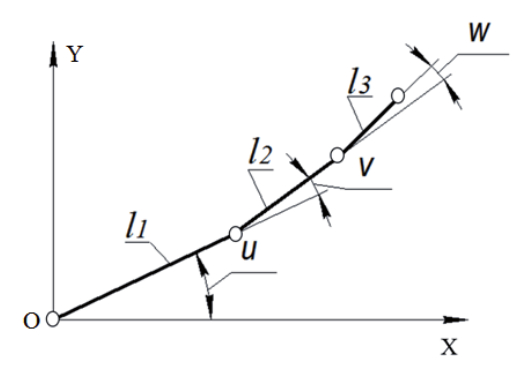 Кинематическая (расчётная) схема планарного ТМ показаны на рисунке 1. Заданы длины звеньев l1, l2 и l3, а также углы поворота звеньев u, v и w (обобщённые координаты).