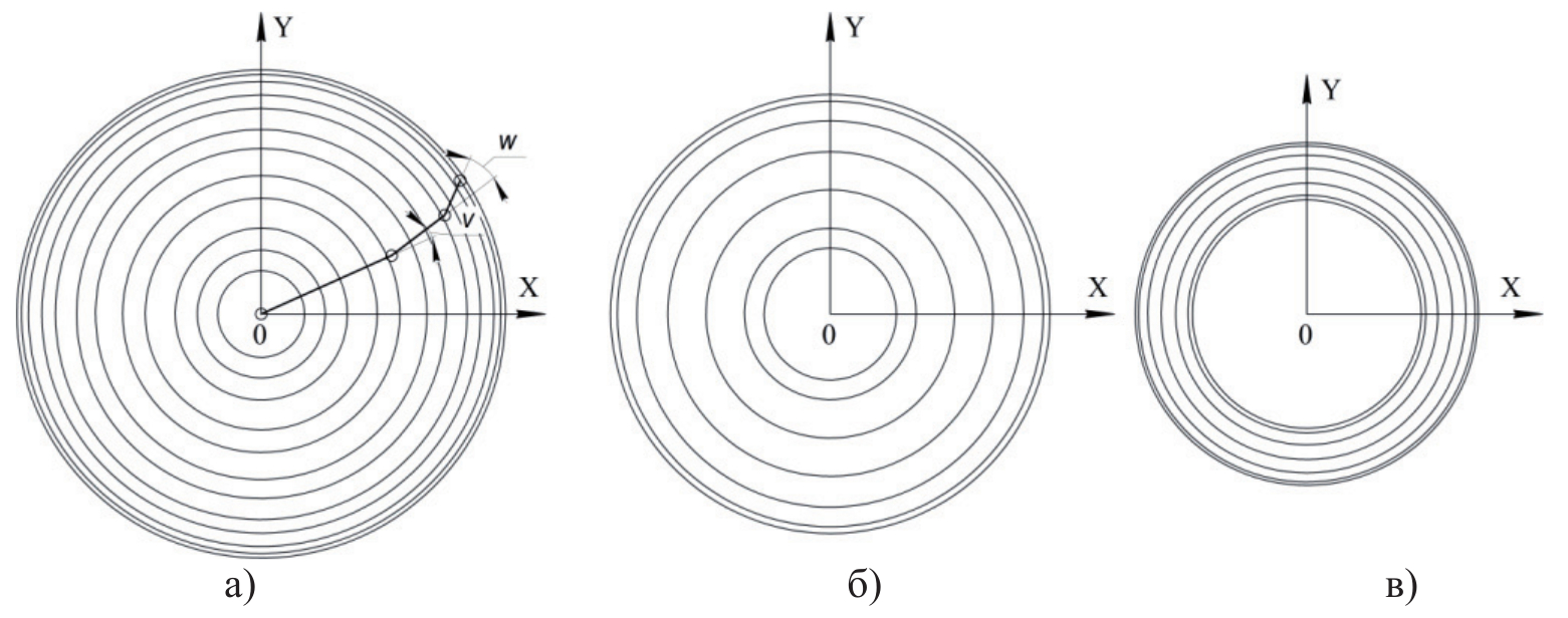 Рисунок 6 – Семейства концентрических окружностей для различных значений параметра v: а) v=0°, б) v=90°, в) v=180°