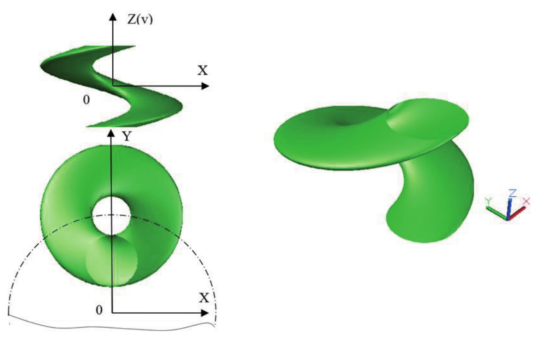 Эта система уравнений описывает трёхмерную гиперповерхность в четырёхмерном пространстве. Одним из вариантов исследования такой поверхности может быть получение её сечений гиперплоскостями. В качестве примера на рисунке 7 приведены каркасные модели двумерных V-поверхностей, полученных в сечении гиперповерхности (8) гиперплоскостями ti. Семейства этих поверхностей являются циклическими винтовыми поверхностями.