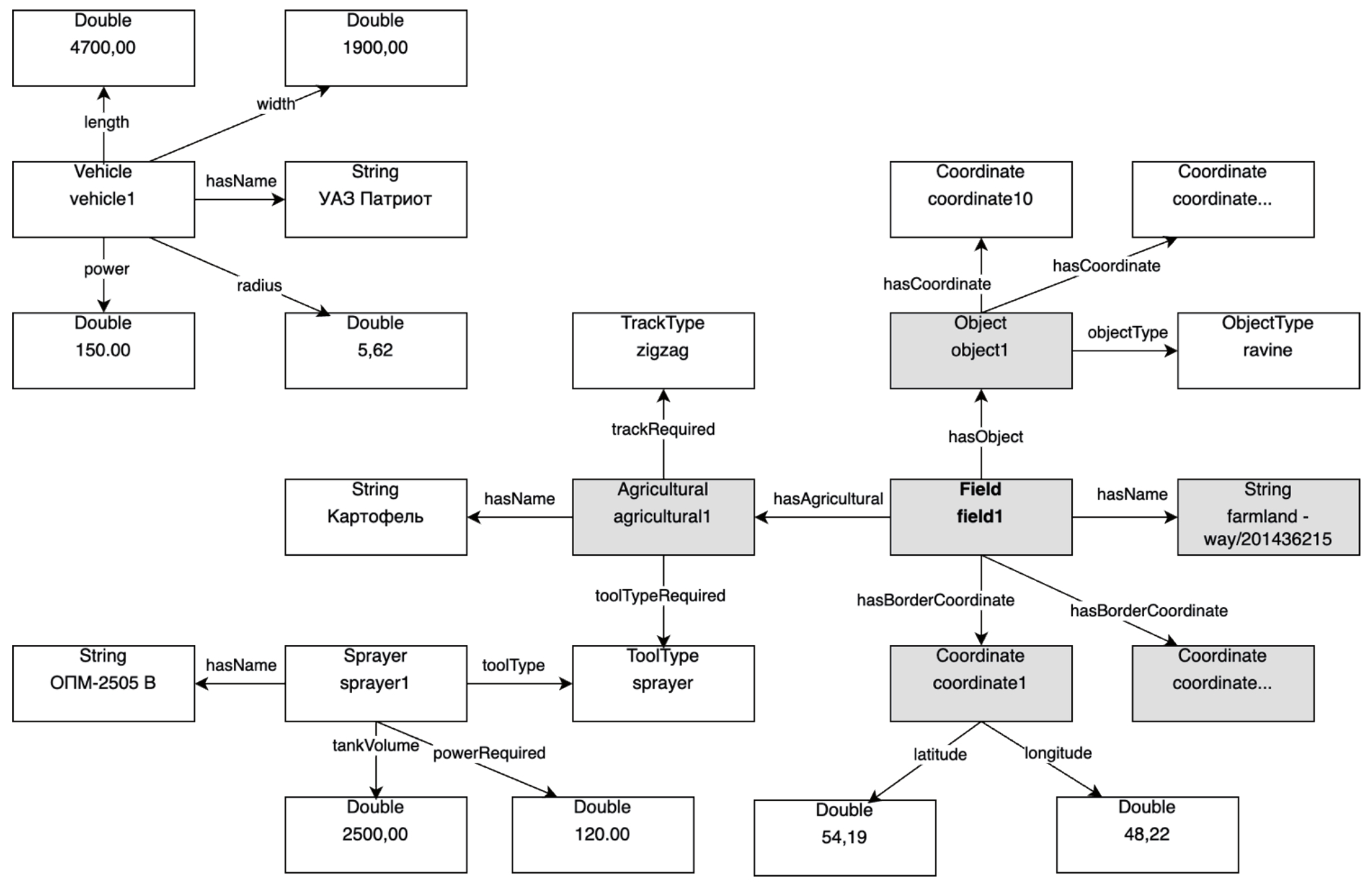 Как видно из рисунка 2, данные о поле записываются в БЗ в качестве фрагмента. Жирным начертанием выделена сущность класса , а фоном отмечены значения свойств сущности . На рисунке 2 приведены также примеры представления сущностей других классов: БПТС УАЗ Патриот, опрыскиватель полевой штанговый полуприцепной ОПМ-2505 В, СХ культура картофель, овраг, расположенный на поле. Для всех обозначенных сущностей заданы значения их свойств.