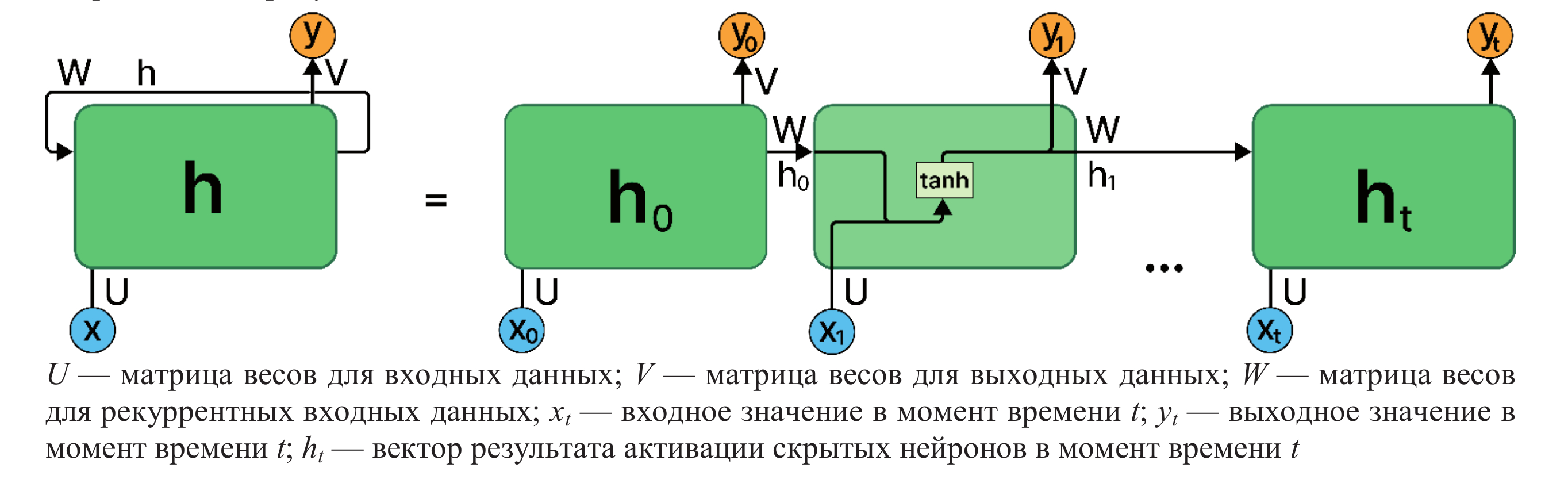 Каждый нейрон, называемый также сумматором, получает входные сигналы с весами, отражающими их значимость [19]. Нейрон суммирует входные сигналы, умножая их на соответствующие веса. РНС представляют собой последовательность одинаковых сетей, позволяющих запоминать и передавать информацию [20]. Схема работы РНС приведена на рисунке 2.
