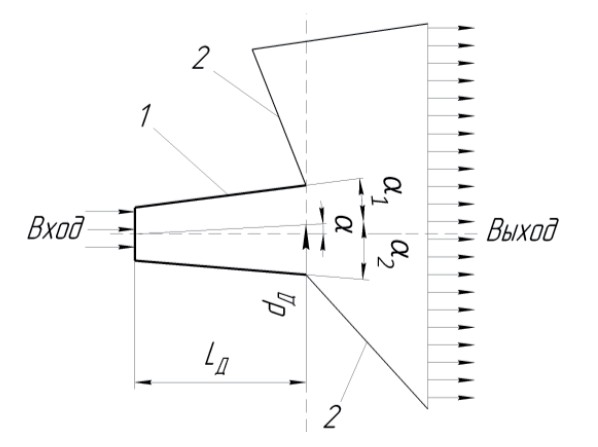 Объектом исследования является диффузор КС с внезапным расширением, схема которого представлена на рисунке 5. Для трёхмерного CFD-расчёта рассмотрен сектор диффузора (10°) кольцевой КС. В процессе расчёта положения входного и выходного сечений и их размеры оставались неизменными. Элементы внутреннего и внешнего корпусов приняты линейными для упрощения автоматического построения конечно-элементной модели (КЭМ). Геометрия диффузора определена следующими параметрами: длина диффузора, диаметр до точки пересечения линии угла нацеливания α с выходным сечением диффузора, α1 и α2 – углы раскрытия стенок диффузора.