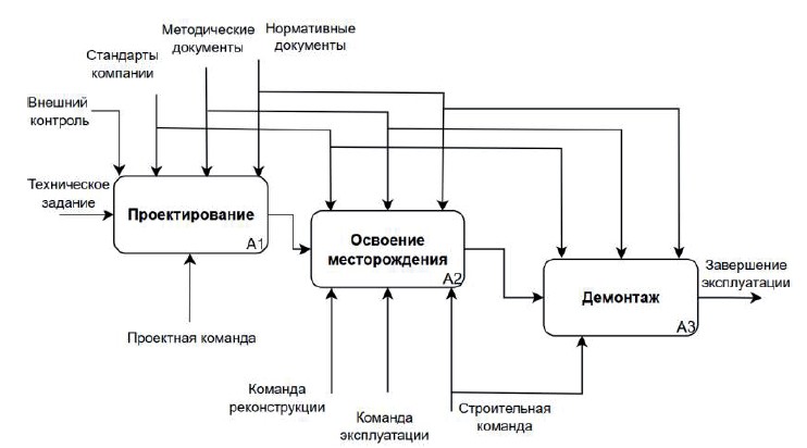 Блоком А0 в нотации IDEF0 представлено обустройство нефтегазового месторождения, которое декомпозируется на стадии: проектирование (А1); освоение месторождения (А2); демонтаж (А3). Согласно ГОСТ Р 59265-20202, который устанавливает требования к видам, составу, структуре, содержанию и порядку оформления технологических проектов разработки морских месторождений, под ЖЦ месторождения понимается его разработка и эксплуатация от момента открытия до ликвидации (консервации) объектов обустройства месторождения. Такое определение позволяет на верхнем уровне разделить ЖЦ объектов обустройства месторождения на три стадии, представленные на рисунке 1.
