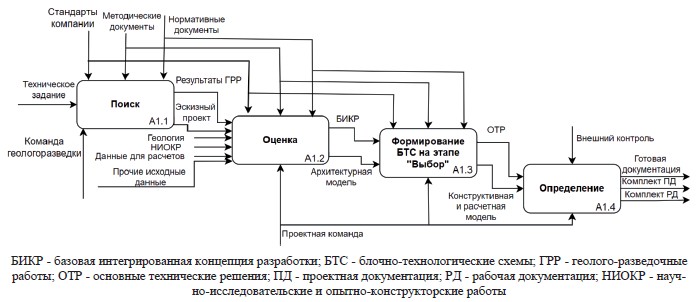 Стадия «Проектирование» (А1) – основа для всех последующих действий, где определяются не только технические параметры, но и экологические, экономические и социальные аспекты3, включает стадии: «Поиск» (А1.1), «Оценка» (А.1.2), «Выбор» (А1.3) и «Определение» (А1.4) (см. рисунок 2). На стадии «Поиск» (А1.1) осуществляется выбор варианта технологии и компоновки оборудования, оптимальной для реализации проекта по техническим, экономическим и временным критериям. Такая декомпозиция основана на методологии, применяемой в крупной нефтегазовой компании4,5. Здесь эскизный проект не включает экономическую оценку проекта, тогда как концептуальный проект, основываясь на эскизном проекте и уточняя его, содержит расчёты экономической обоснованности проекта.