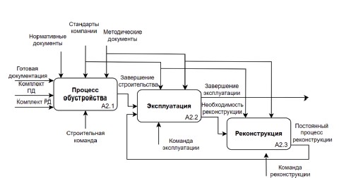 Декомпозиция стадии «Освоения месторождения» (А2) показана на рисунке 3 и состоит из следующих процессов: «Процесс обустройства» (А2.1), «Эксплуатация» (А2.2) и «Реконструкция» (А2.3). Основной