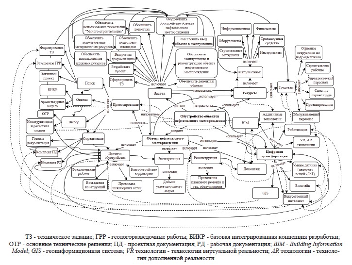 Данная онтология отражает ключевые отношения между процессом обустройства НГМ, задачами, которые для этого необходимо выполнить, требующимися ресурсами и цифровыми технологиями. В онтологии выделены ключевые процессы: проектирование, процесс обустройства, эксплуатация, реконструкция и демонтаж. Фрагмент онтологии отражает: