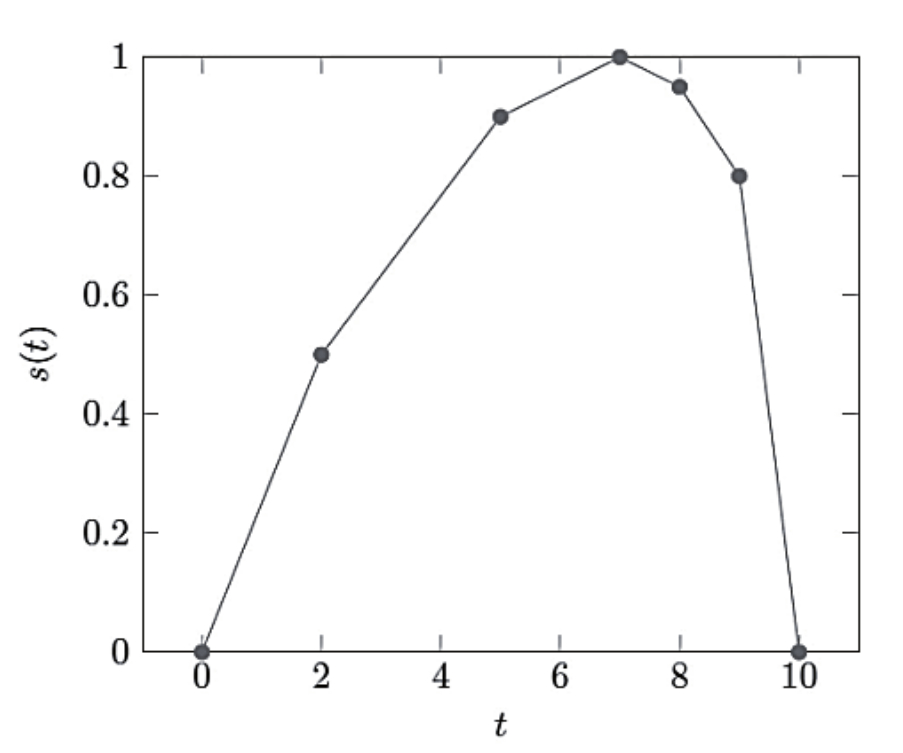 Каждая задача oi из набора O характеризуется длительностью выполнения и моделью функции удовлетворённости. Модель функции удовлетворённости si представляет собой набор точек , где – показатель удовлетворённости задачи в случае её выполнения в момент времени t (см. рисунок 1). Функция удовлетворённости может принимать значения в диапазоне . Временная ось не имеет ограничений. Для удобства восприятия графической информации в данной работе используется упрощённое представление – в секундах, от 0 до 10 включительно.