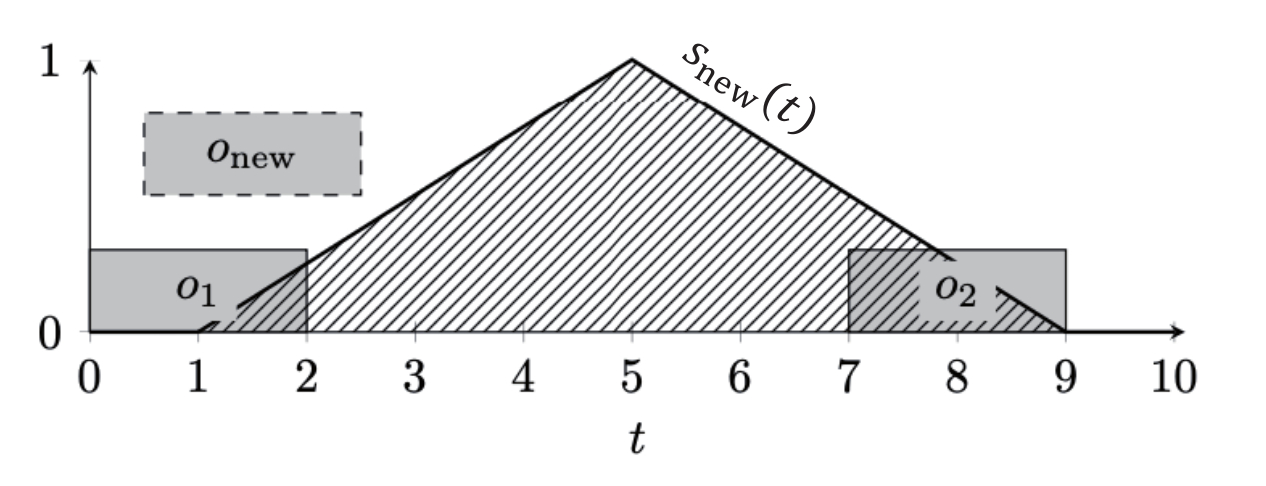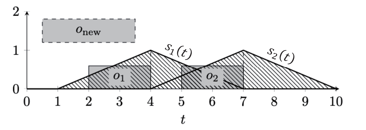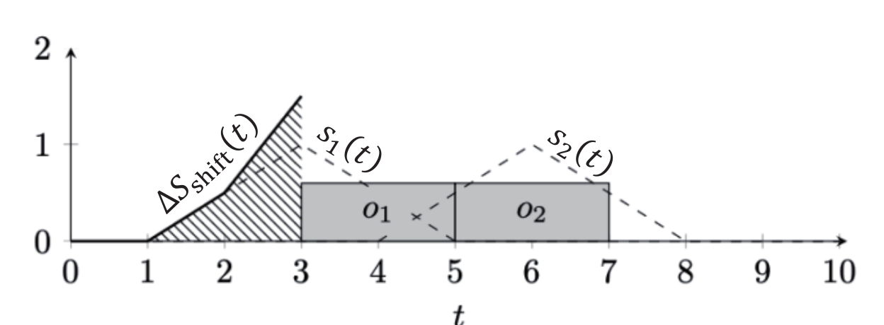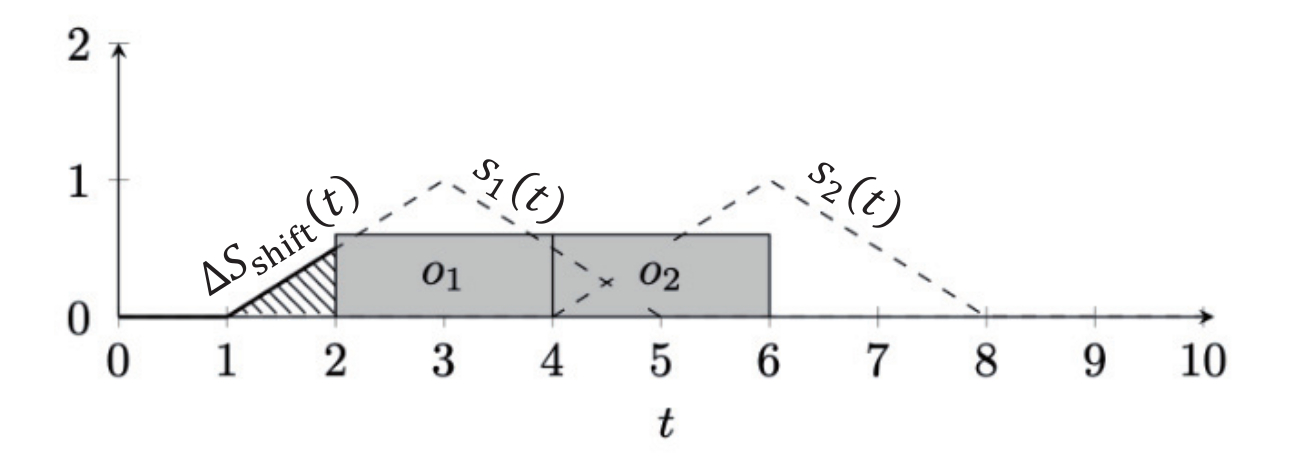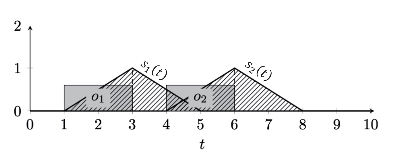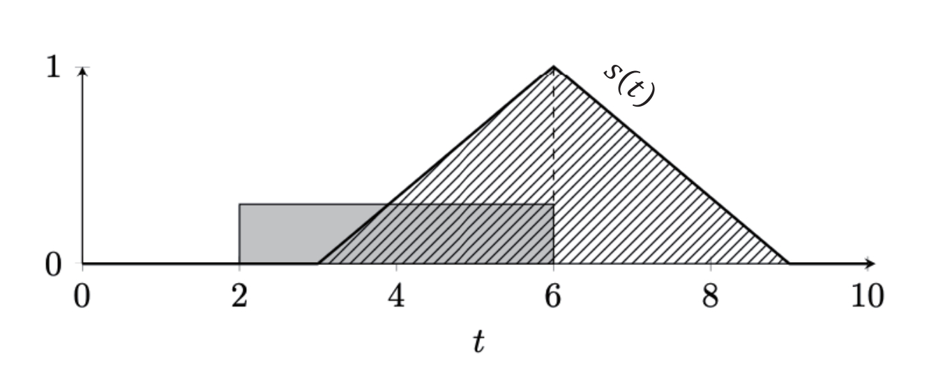 На рисунке 2 показан график, где в качестве примера на общей временной оси представлена задача длительностью 4 секунды (фигура, заполненная сплошной заливкой) и её функция удовлетворённости (фигура, заштрихованная под углом 45 градусов). В данном примере задача находится в оптимальном положении, при котором время её выполнения соответствует наибольшему из возможных значений её функции удовлетворённости.