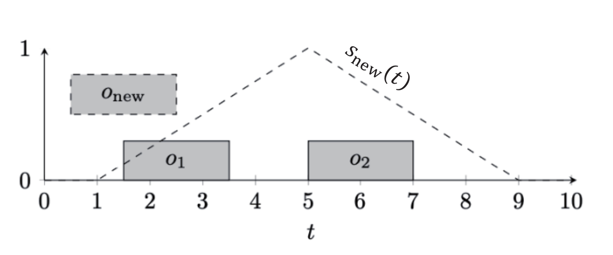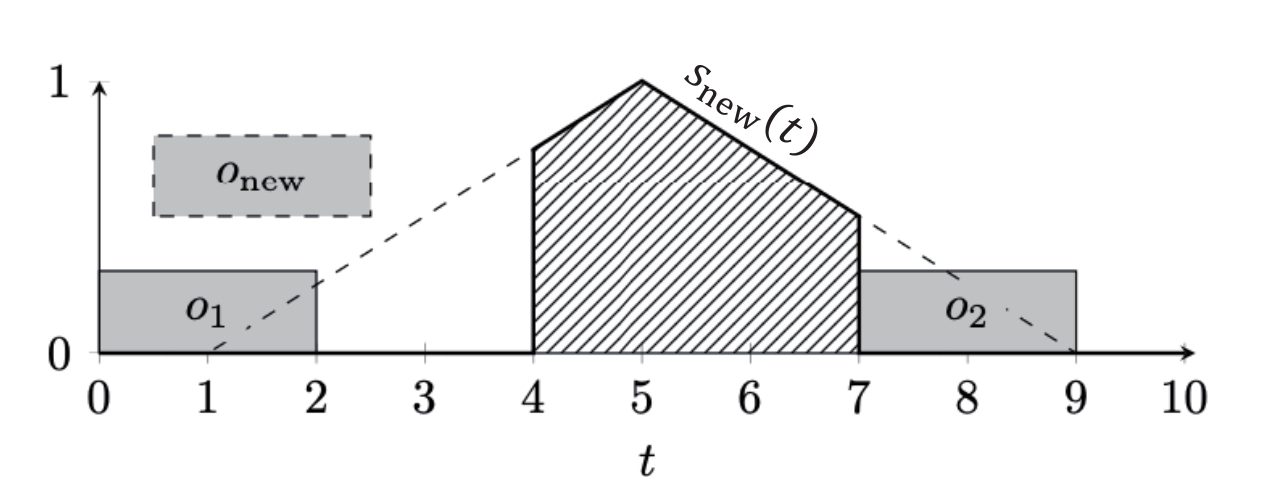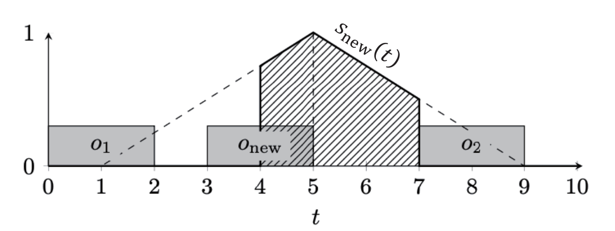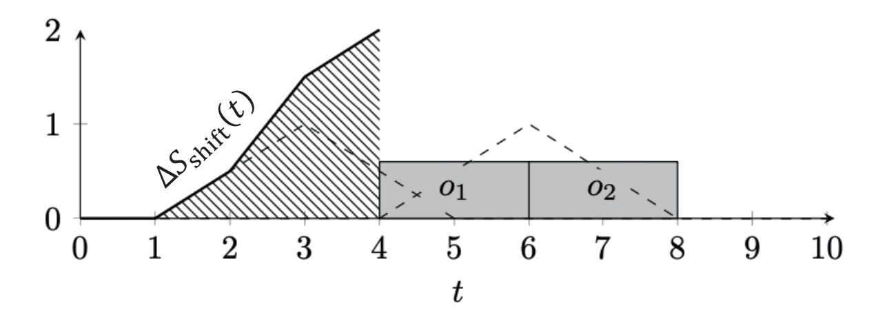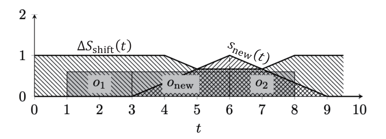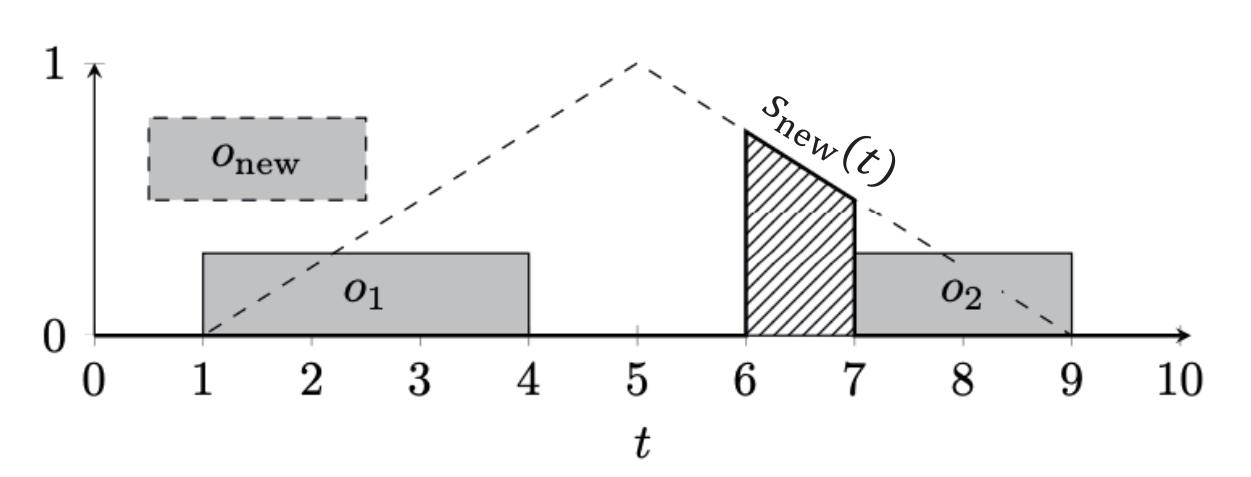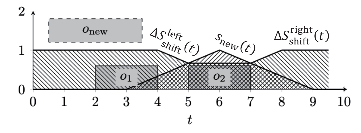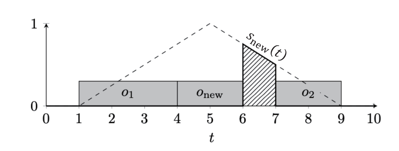 В отличие от правосторонней функции стоимости сдвига левосторонняя отражает потерю в ПОУС при сдвиге времени окончания обработки задачи o1 и выбранном начале времени обработки задачи onew. Чтобы две функции стоимости сдвига можно было сложить, необходимо предварительно сместить левостороннюю компоненту вперёд на промежуток, равный длительности новой задачи onew (рисунок 18). Результат сложения обеих частей функции стоимости сдвига и функция удовлетворённости snew представлены на рисунке 19.