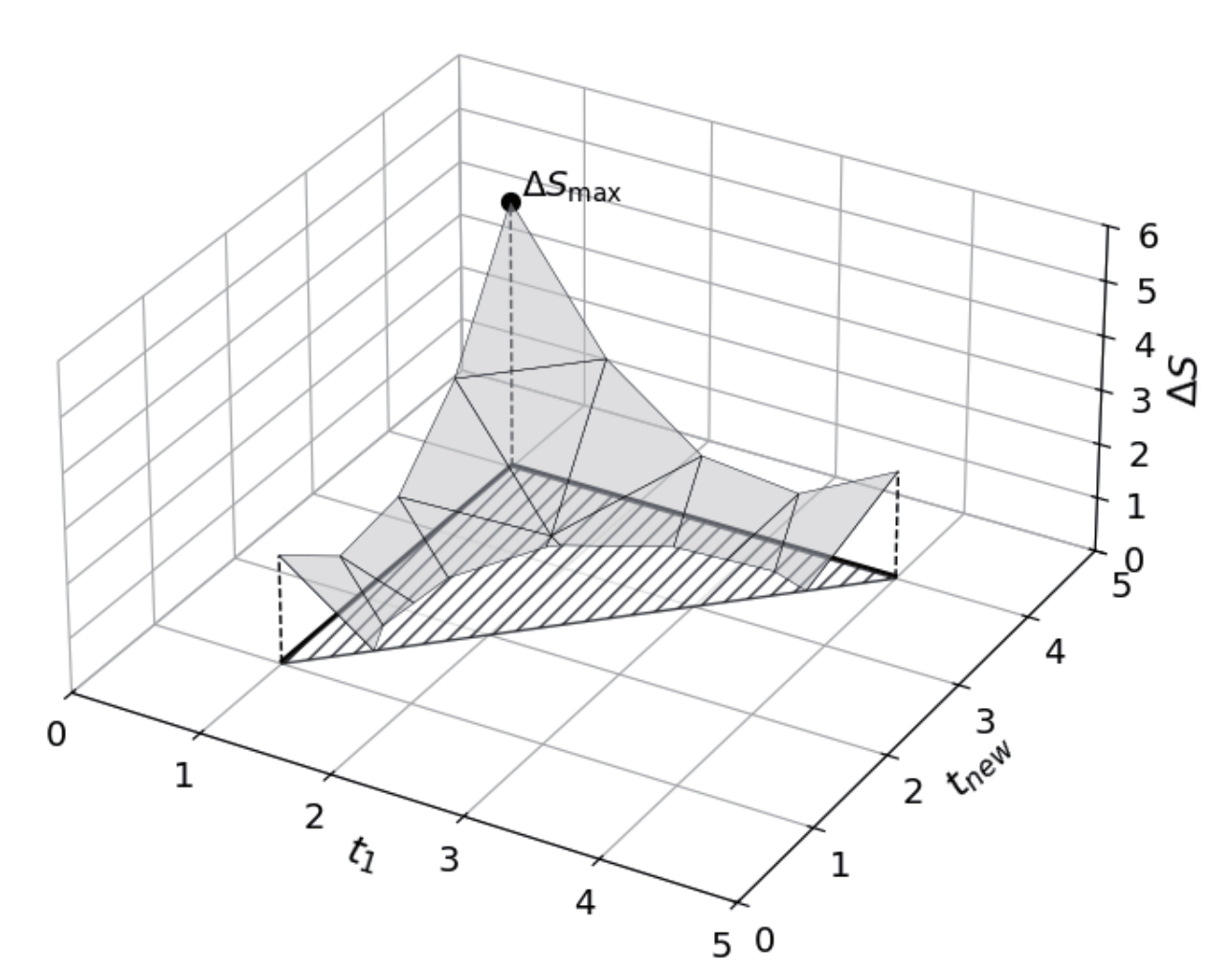 Новую задачу можно разместить между любыми двумя задачами или по краям расписания. При этом можно сместить любую из размещённых в расписании задач так, чтобы забронированные ими временные участки не пересекались. Всего вариантов размещения новой задачи относительно находящихся в расписании задач I+1, где I – количество задач, уже размещённых в расписании. Для каждого варианта размещения рассматривается до K вариантов сдвига других задач: где Ti – количество опорных временных точек модели функции удовлетворённости si задачи oi. Область возможных решений представляет гиперповерхность в пространстве размерности I+2, где:
