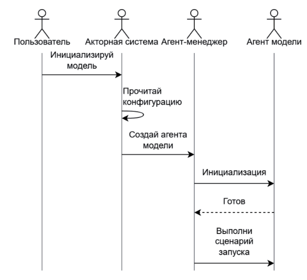 Агент-менеджер выступает в роли посредника, так как только он хранит информацию о всех активных агентах модели. Агент-менеджер включает агента модели в список активных агентов после получения от него сообщения о готовности к работе и сообщает ему команду для выполнения сценария запуска. Данное разделение процесса служит для предотвращения двух неблагоприятных случаев: агент, не завершивший инициализацию, получает сообщение от другого агента модели; агент модели получает сообщение от агента, которого нет в списке активных агентов. Таким образом гарантируется, что отправитель и получатель любого сообщения между агентами модели включены в список активных агентов.