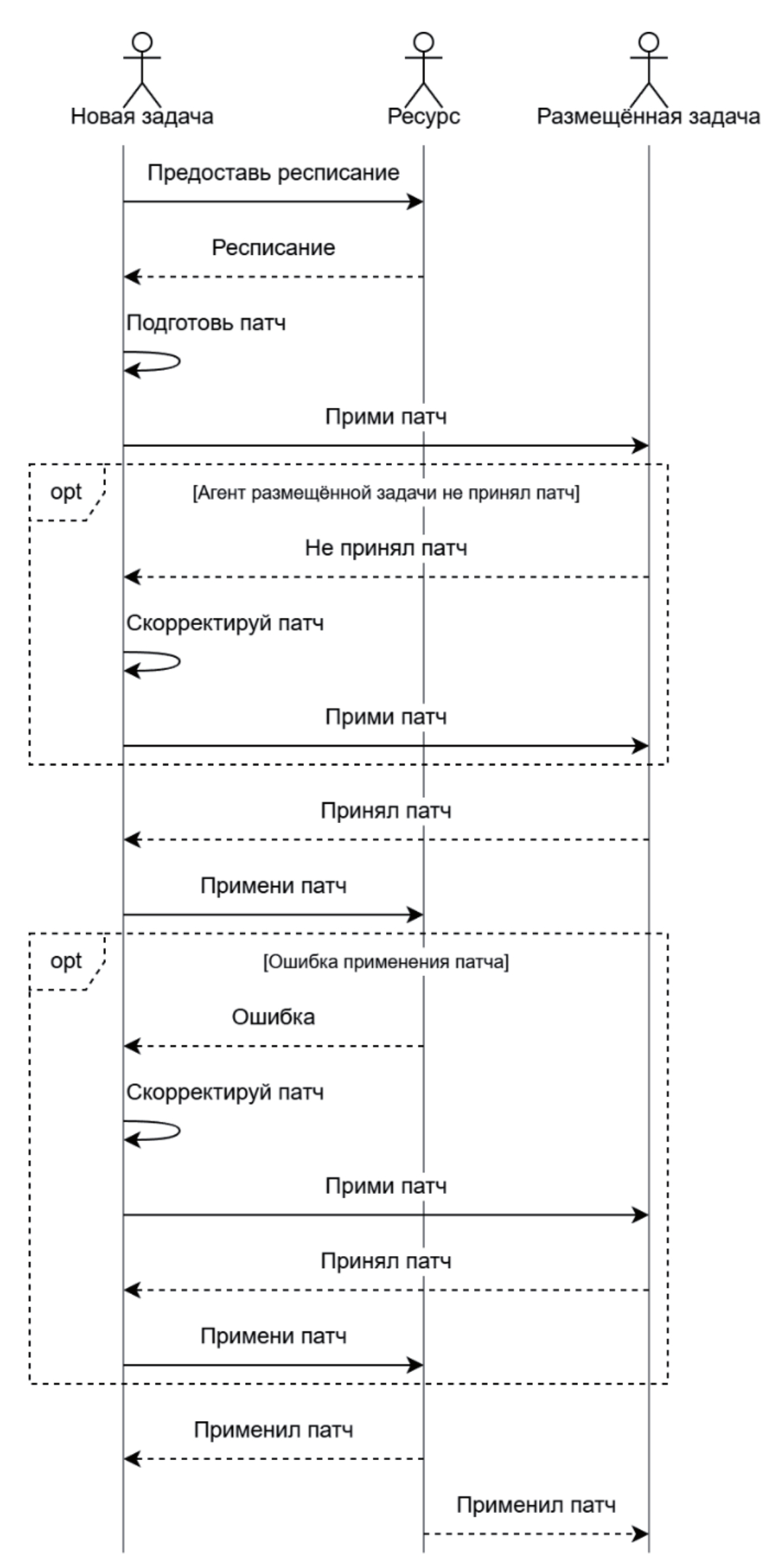 Чтобы забронировать ресурс, агент задачи (агент-инициатор) запрашивает информацию о расписании у агента ресурса и рассчитывает патч, включающий добавление собственной задачи в расписание (рисунок 24). Если патч содержит изменения состояния других задач, то агент-инициатор направляет им патч на просмотр. Агент задачи может принять либо отвергнуть патч, в зависимости от своей модели поведения. Сообщение о непринятии патча содержит причину отказа, которая используется для его корректировки.
