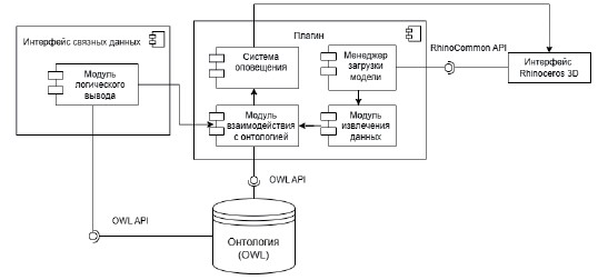 - Модуль взаимодействия с онтологией обеспечивает связь между характеристиками информационной модели Rhino и онтологией. Этот модуль использует OWL API для аннотации объектов модели семантическими метаданными и установления связей между ними.