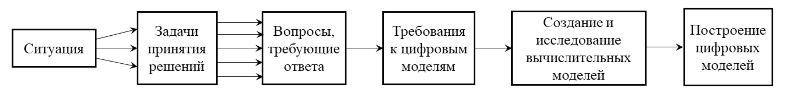 В ситуации принятия решения возникает ряд задач, которые определяют целесообразность одного из альтернативных вариантов действий. Решению этих задач предшествуют формулировка перечня вопросов и содержания ответов на них, а также требований к ЦМ, которые должны обеспечивать получение необходимых ответов. Эти ответы получаются путём создания и применения соответствующих ЦМ. Результаты исследований ЦМ могут быть многократно использованы в ситуации быстрого принятия решений в практических задачах.