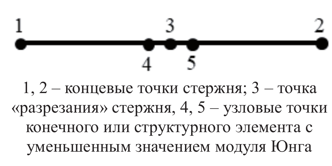 Указанные технологии поясняются следующей схемой (рисунок 3). Первоначально целостный структурный элемент ограничен точками 1 и 2. Анализ конструкции с удалённым стержнем предполагает исключение стержня 1-2; с рассечённым стержнем – замену стержня 1-2 парой стержней 1-3 и 3-2 с разрывом связи в точке 3. По технологии РСЭ возможны следующие варианты. В разрушаемом сечении стержня 1-2 генерируется «умирающий» КЭ 4-5 с пониженным модулем Юнга. В некоторых случаях возникает необходимость имитировать технологию РСЭ на геометрической модели. Тогда исходный стержень 1-2 разделяется на три стержня 1-4, 4-5 и 5-2 с заданием для стержня 4-5 свойств материала с уменьшенным модулем Юнга.