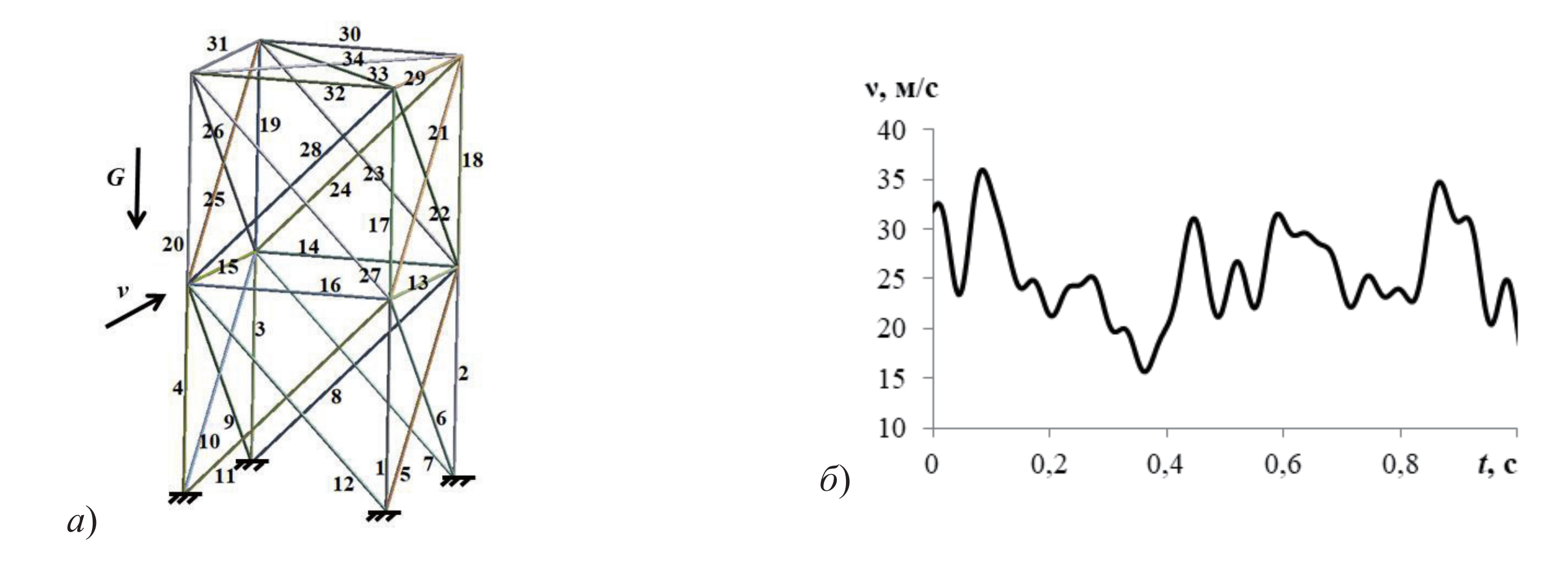 В качестве модельной задачи рассматривается стальная пространственная стержневая система рамного типа с жёсткой заделкой в четырёх точках. Система содержит 34 стержня (рисунок 5а), каждый из которых может быть разрушен. Статическая нагрузка представлена собственным весом G, динамическая – боковым ветром, скорость которого предполагается случайной величиной со значением, характерным для местности размещения конструкции (рисунок 5б). В качестве такого значения принята скорость ν = 25 м/с.
