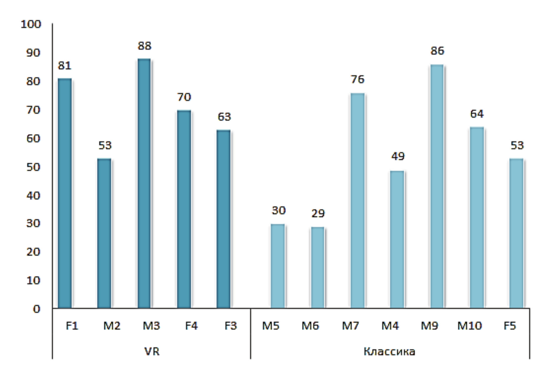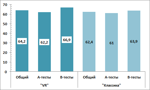 В работе приводятся результаты начального этапа исследовательских работ. Для окончательных выводов пока недостаточно располагаемого объёма достоверных данных. Этим обстоятельством может объясняться существенное различие между представленными результатами и полученными в работах [15-16]. В статье сделана попытка сравнить два подхода с точки зрения подачи разнотипной учебной информации, выявляя их сильные и слабые стороны, с целью составления в будущем обоснованных рекомендаций для методистов-интеграторов электронных образовательных сред по соотношению классических и ВР-подходов в перспективной системе подготовки обучающихся. Учитывая небольшой исходный объём данных, приведённые результаты носят предварительный характер (рисунок 7). Целесообразно учитывать общую успеваемость обучающегося, что позволяет понять, является ли итоговый балл следствием влияния концепции обучения или же это отражение общего уровня знаний и личностной организации студента5.