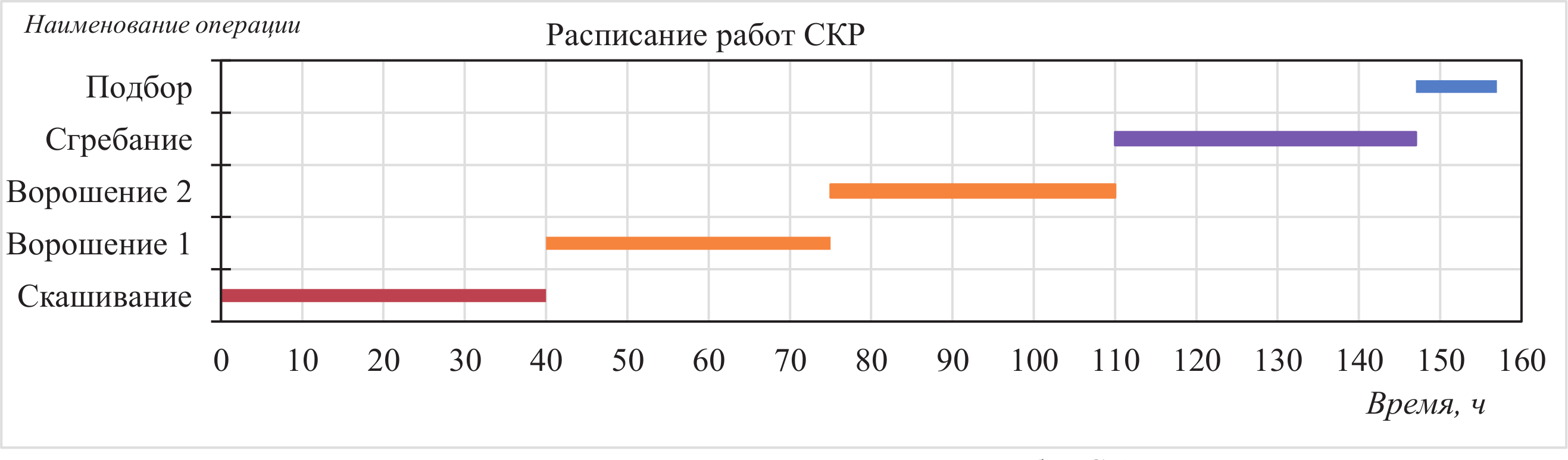 Известны виды планирования (стратегическое, календарное, тактическое и оперативное), где главное внимание уделяется процессам взаимодействия сложного объекта (в данном случае СКР) [7]. Стратегическое (объёмное) планирование заключается в прогнозировании объёмов и качества заготавливаемых кормов; оперативно-календарное планирование – в составлении для конкретного интервала времени расписания работ СКР, входящих в состав соответствующих технологических операций, а также в выборе наиболее предпочтительной последовательности операций, обеспечивающих эффективность процессов УТ.