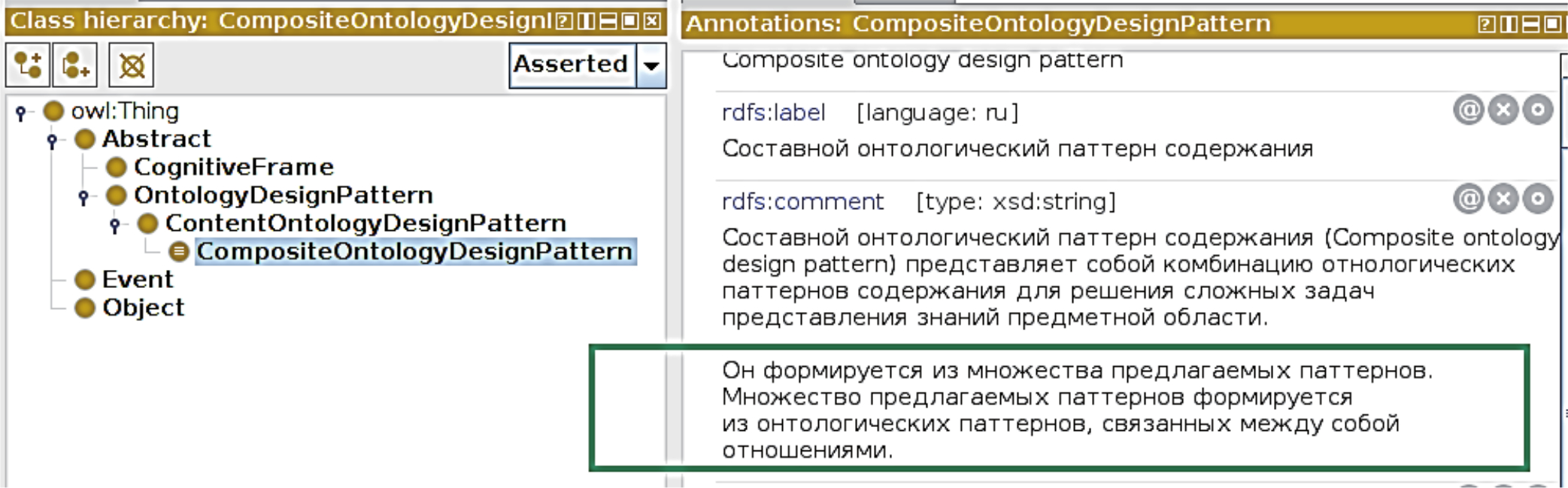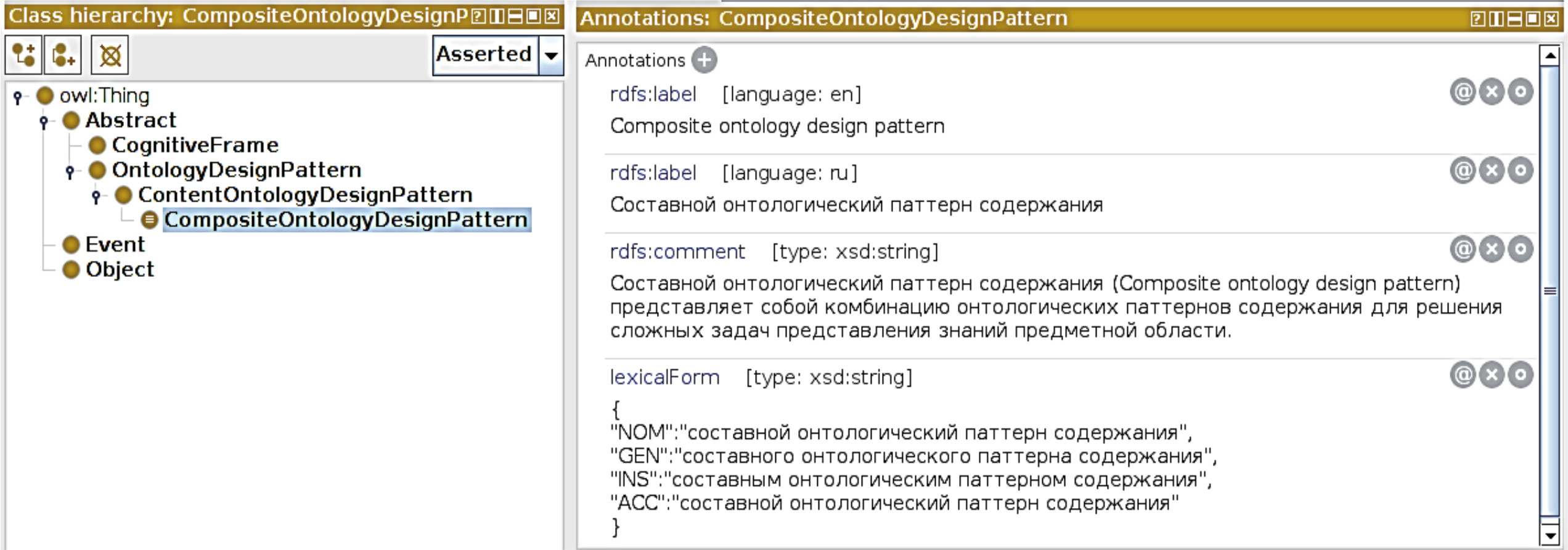 Рисунок 1 – Фрагмент онтологии с лексическим представлением понятия онтологии «Составной онтологический паттерн содержания» (Composite ontology design pattern)