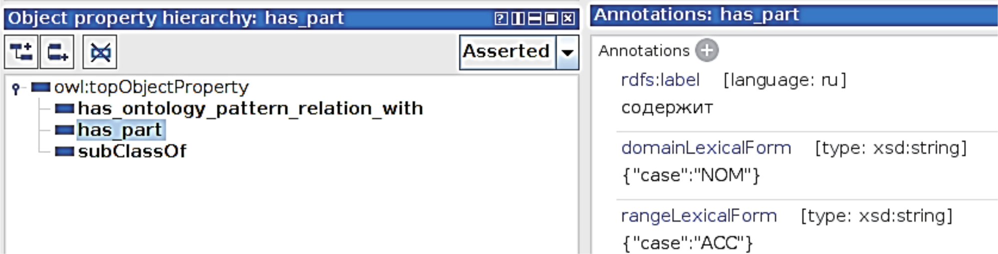 Понятия CompositeOntologyDesignPattern, ContentOntologyDesignPattern используются в данной аксиоме, как носитель и значение свойства has_part, лексическое представление которого предписывает использовать для них соответственно формы именительного {case: NOM} и винительного {case: ACC} падежей (рисунок 1), т.е. «Составной ОП содержания» и «ОП содержания». Свойство has_part имеет наименование «содержит». Таким образом, ЕЯ предложение для рассматриваемой аксиомы имеет вид: