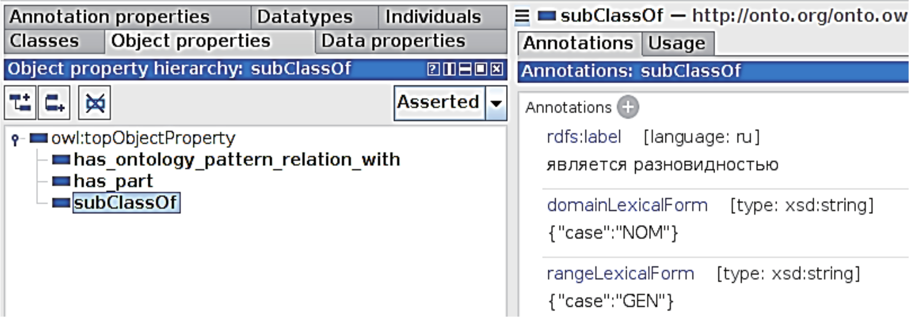 Рисунок 3 - Фрагмент онтологии с лексическим представлением отношения наследования (subClassOf)