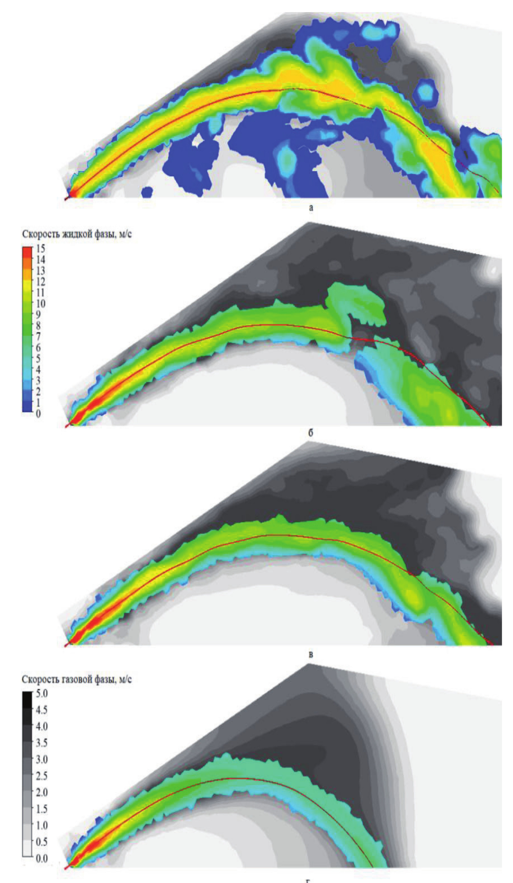 Существенные отклонения целевых характеристик, полученные с использованием моделей k-ω и Эйлера (г и д, таблица 2), можно объяснить подбором значений их параметров, не соответствующих особенностям исследуемых процессов. Однако, даже для таких настроек при достаточно большом времени расчёта наблюдаются слабо (по сравнению со схемами k-ε+VOF) выраженные турбулентность и явления распада сплошного потока (рисунок 4) вследствие значительного снижения скоростей движения жидкой фазы на начальном участке.