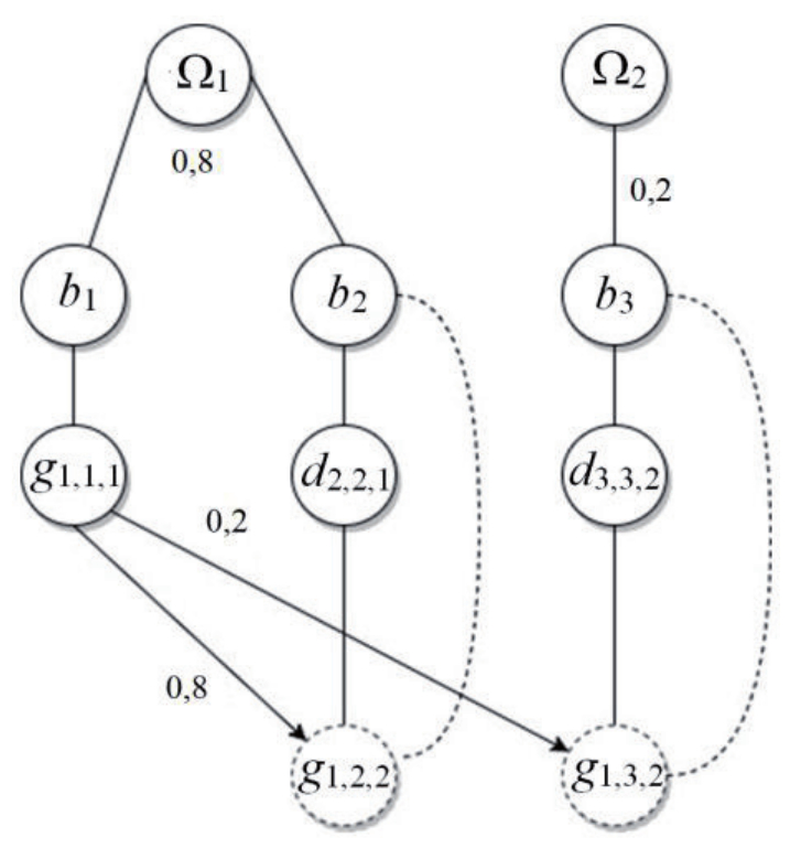 Пример 1. Пусть имеется пользователь, в поле зрения которого находятся объекты b1, b2, b3, релевантные его текущему интересу (см. рисунок 2). Объекты b1 и b2 относятся к тематике W1(b1,2), которая соответствует целевой тематике интереса пользователя на величину 0,8. Объект b3 относится к тематике W2(b3), соотносящейся с целевой тематикой на 0,2. Пусть взгляд пользователя g1,1,1 в момент времени t1,1,1 обращён на объект b1. При этом наблюдается изменение состояния объектов b2 и b3, обозначенное как d2,2,1 и d3,3,2 соответственно, тогда вероятность перевода взгляда пользователя на объект b2=0,8, а на объект b3=0,2 с учётом соотношения данных объектов с целевым интересом пользователя.