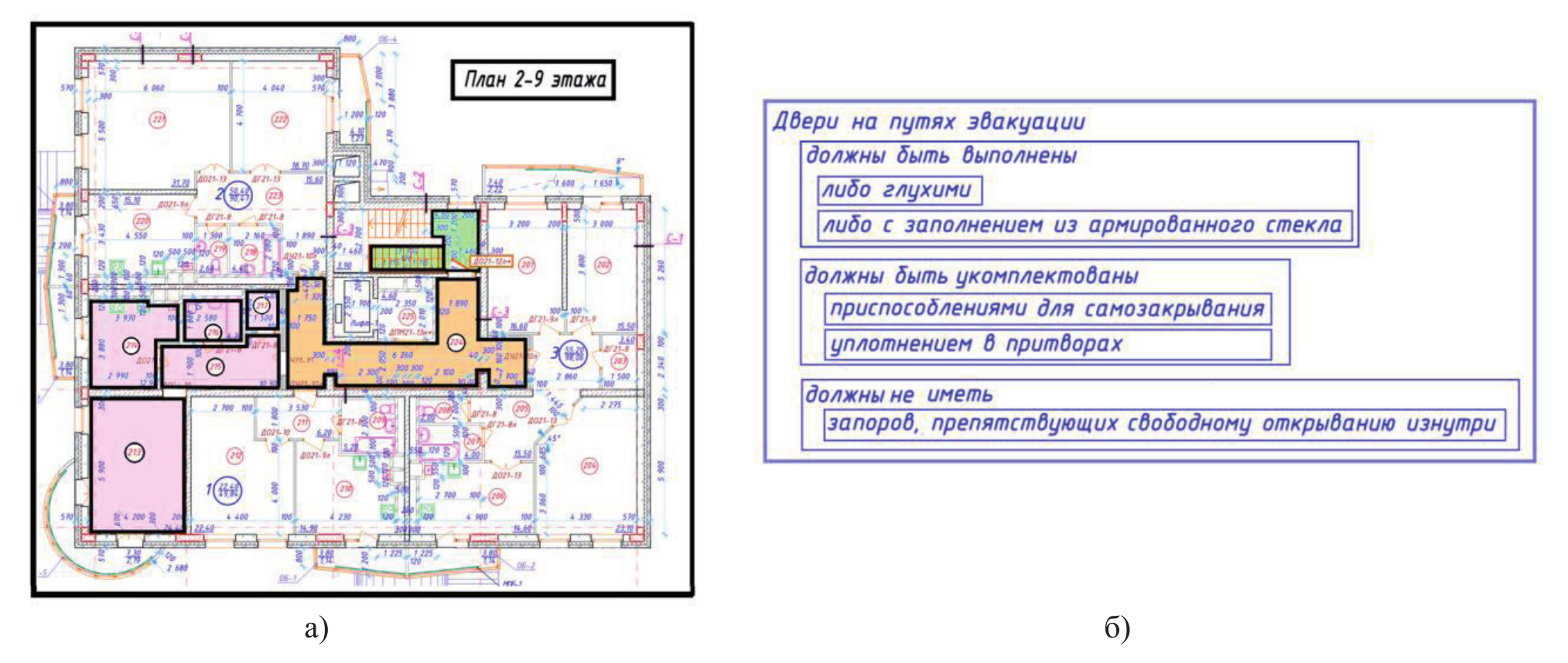 План типового этажа (рисунок 4а) можно рассматривать как сложную пиктограмму, включающую в себя пиктограммы стен, помещений, оборудования и т.п. На плане выделены пиктограммы помещений угловой квартиры и помещений, лежащих на пути эвакуации из квартир. На рисунке 4б перечислены требования к дверям на путях эвакуации. В целях облегчения машинной обработки текст структурирован по признакам «исполнения», «комплектации» и «запрета».