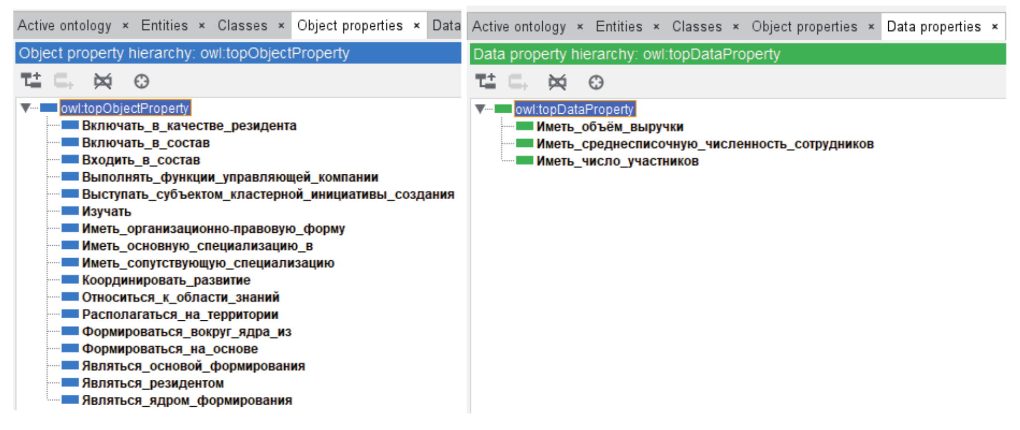 Представление экономической концепции кластера в форме онтологии ПрО «Кластеры» также включает задачу систематизации используемых в её рамках отношений (object properties, data properties, см.рисунок 5).