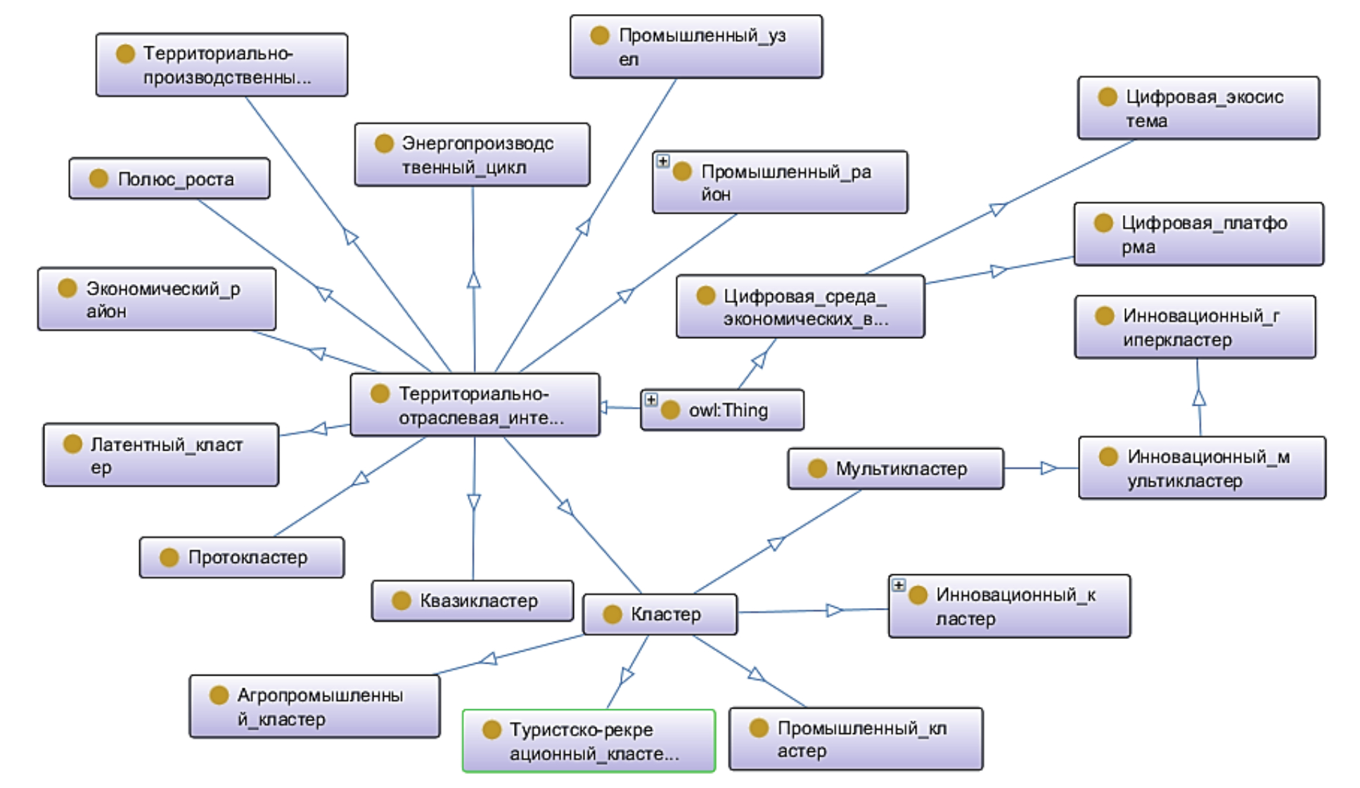Рисунок 6 – Структура отношений между основными видами кластеров и образований кластерного типа (выполнено с помощью инструмента OntoGraf в редакторе Protege)