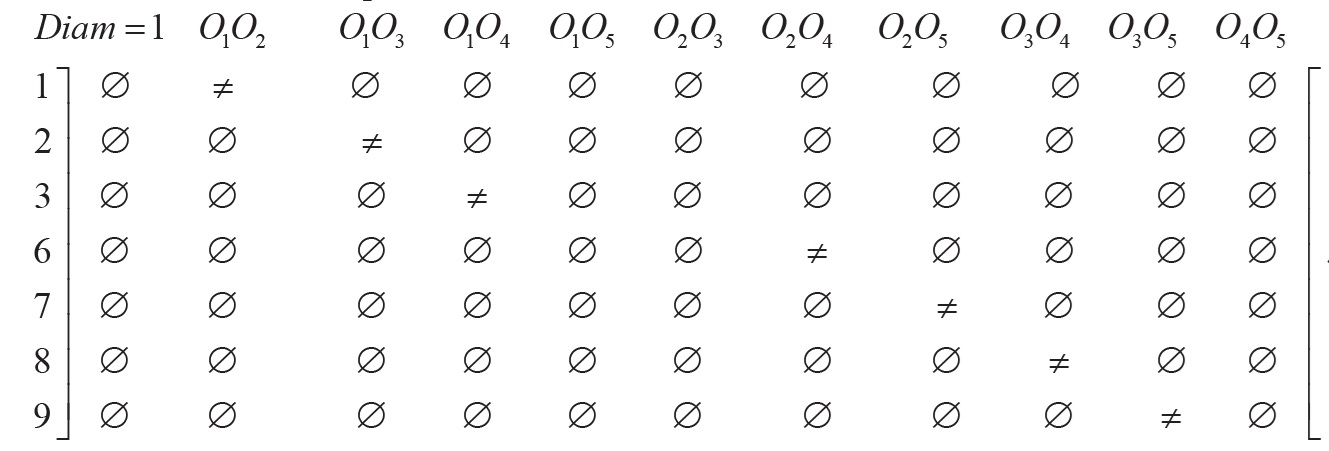 Первый столбец описывает тот факт, что объект O1 принадлежит первому кластеру (O1=1). Этот факт здесь и далее добавлен для исключения симметрии в получаемых решениях. Из анализа полученной смарт-таблицы С-типа (утверждения 6 и 7), во-первых, следует, что объект O1 должен лежать в разных кластерах с объектами O2 и O4, а, во-вторых, что объекты O2 и O4 не могут лежать в одном кластере. Эти два условия не могут быть одновременно удовлетворены при количестве кластеров равном двум. По той же причине минимальное значение диаметра разбиения не может быть равно 2.